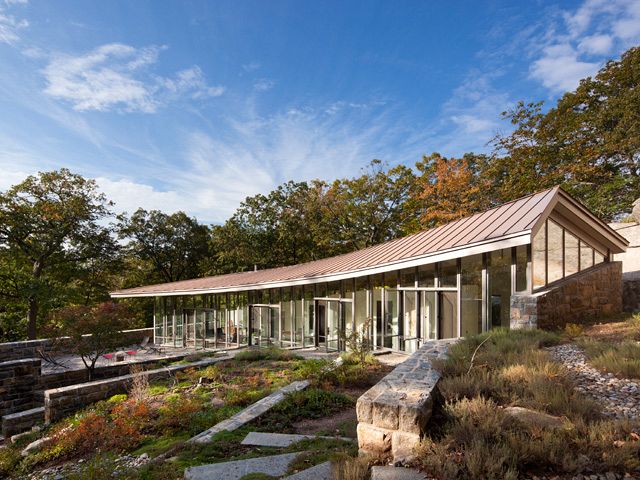 The residence "almost melts into the landscape, peeking out from behind layered stone walls that ascend 30 feet high," states WSJ reporter Nancy Keates. Merging with the stone outcropping of its historic setting at Tuxedo Park in New York, the architecture and landscape shape a new inhabitable topography.