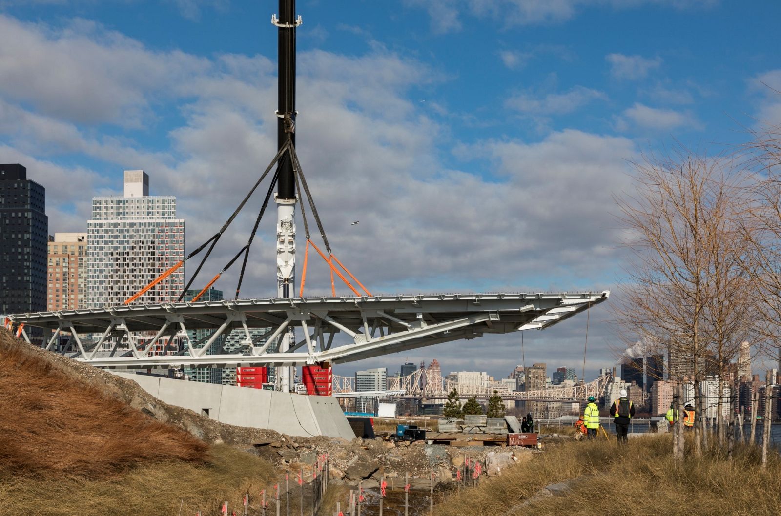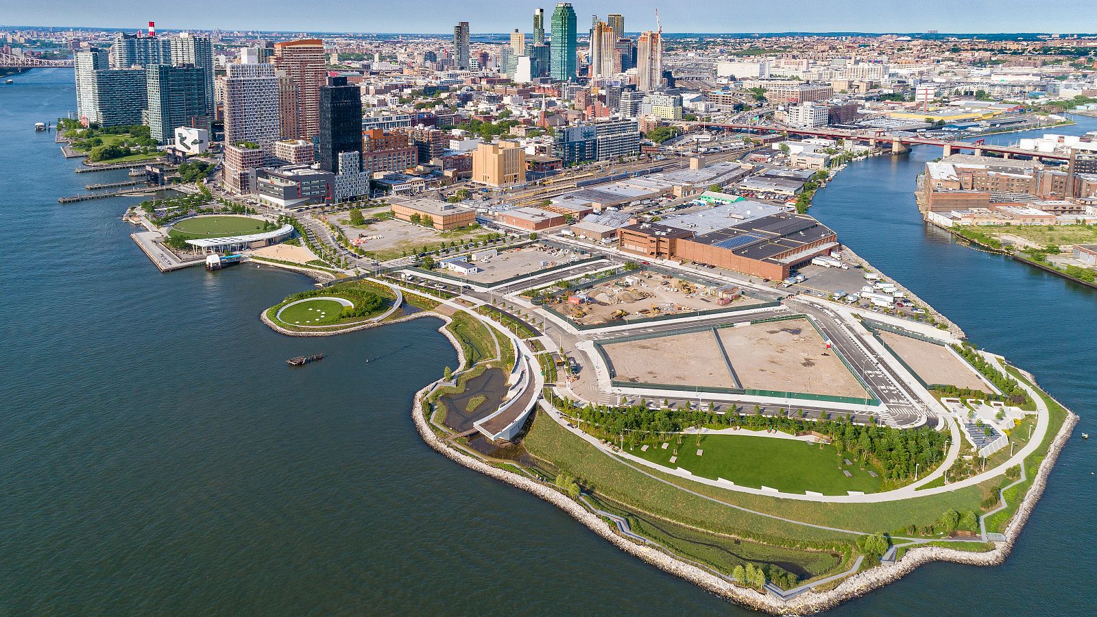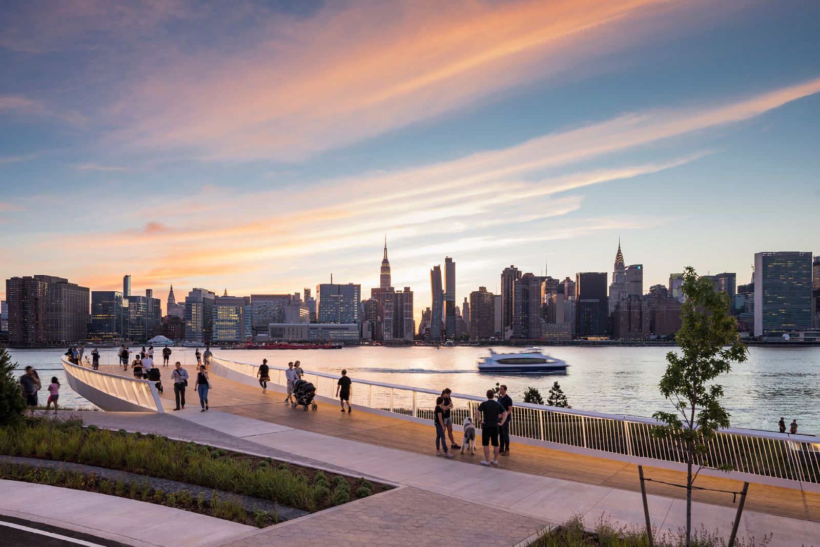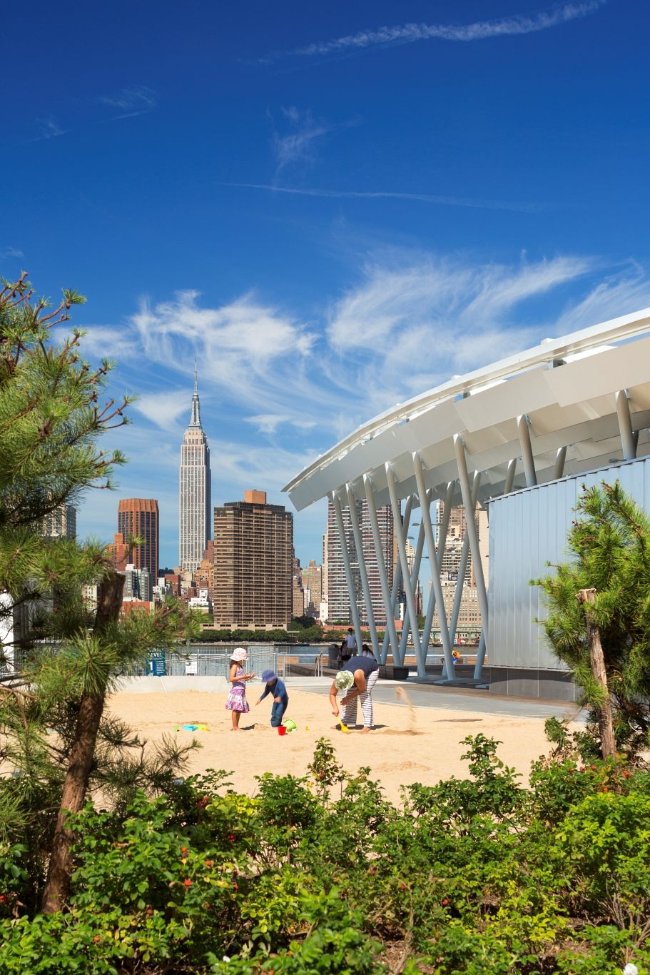 A sand-covered beach overlooks a landing for the East River Ferry, tying into a larger connective loop of the Manhattan, Brooklyn, and Queens waterfronts, bringing the city to the park and the park to the waterfront.