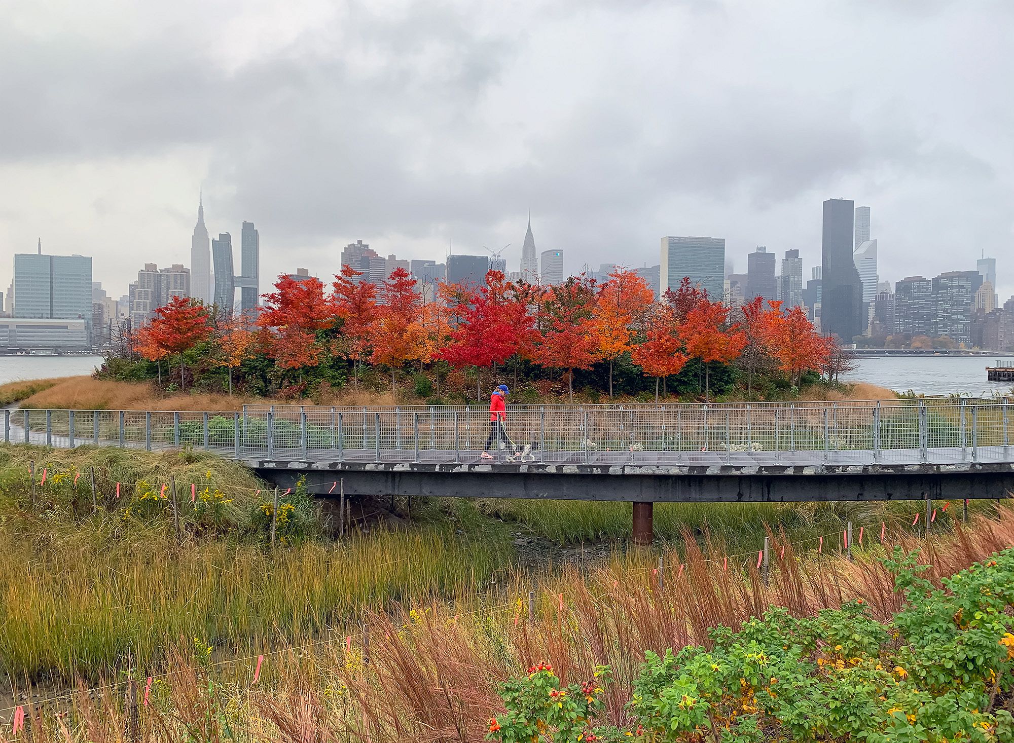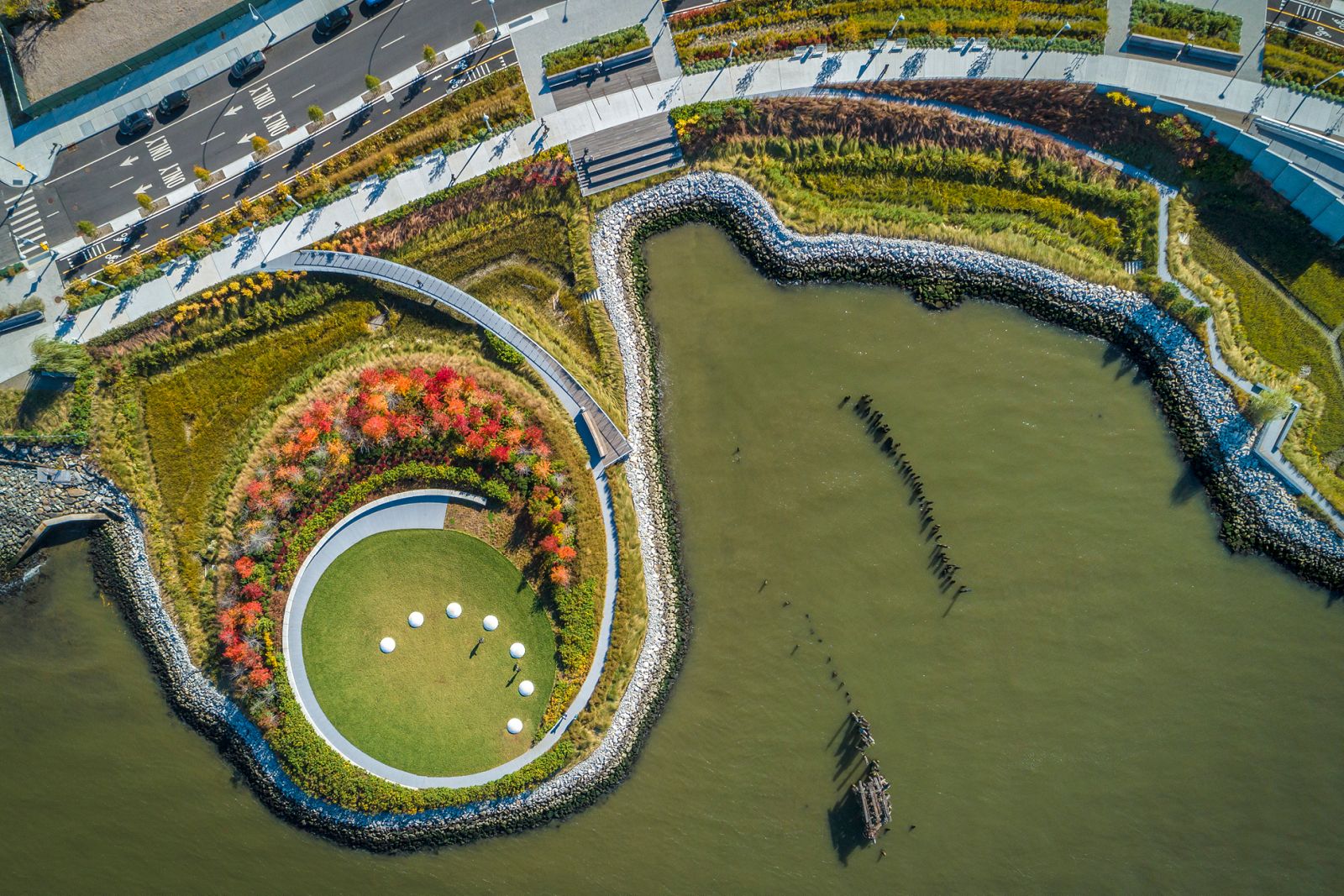 Designed to accommodate floodwaters, the park is planted with native, salt-tolerant species such as coastal little bluestem, seaside goldenrod, and purple coneflower, which can survive an encounter with brackish river water.