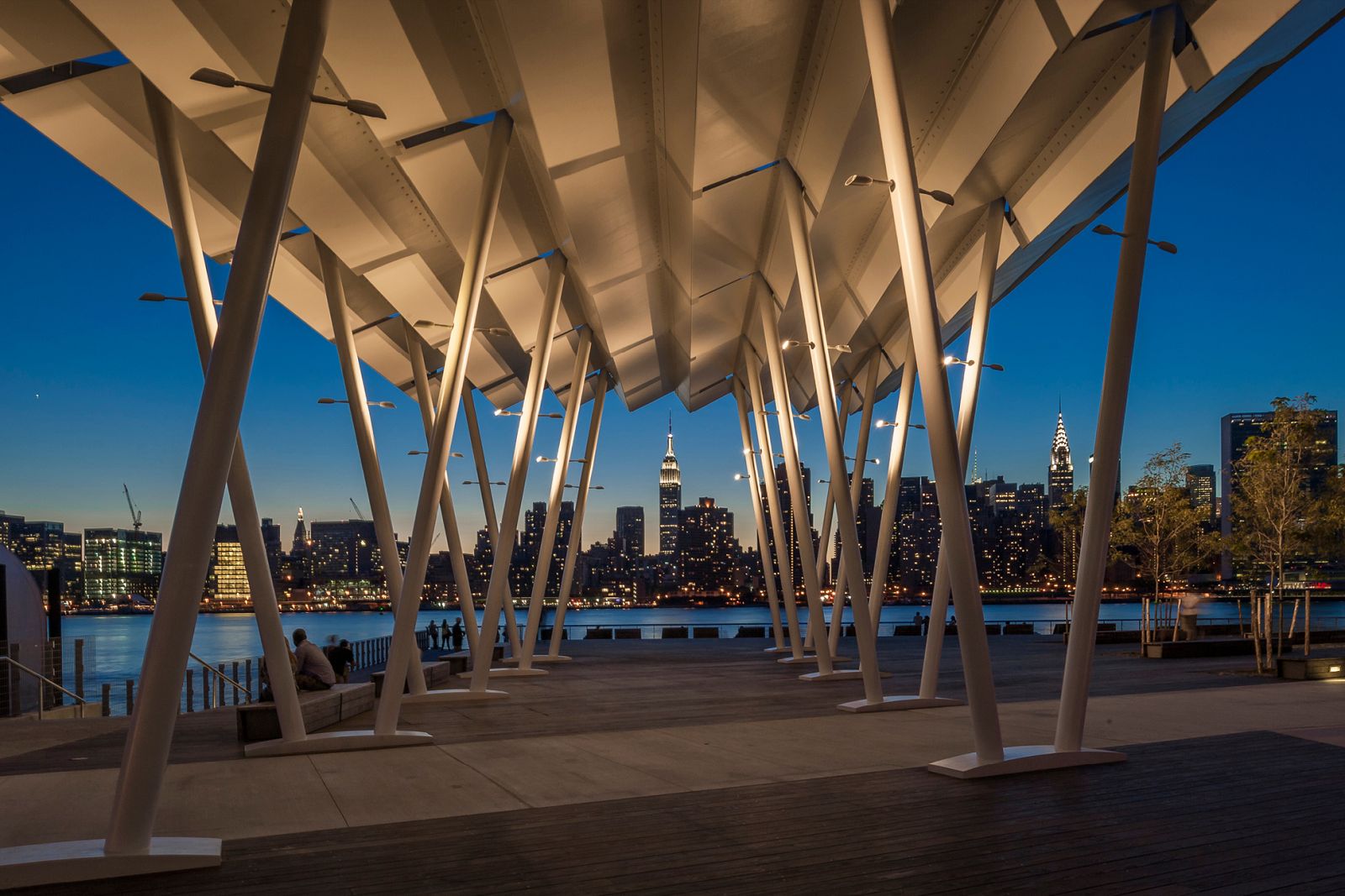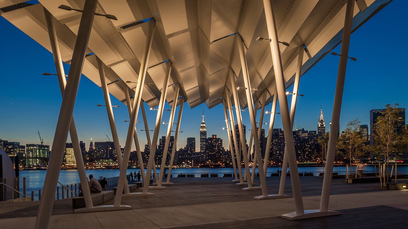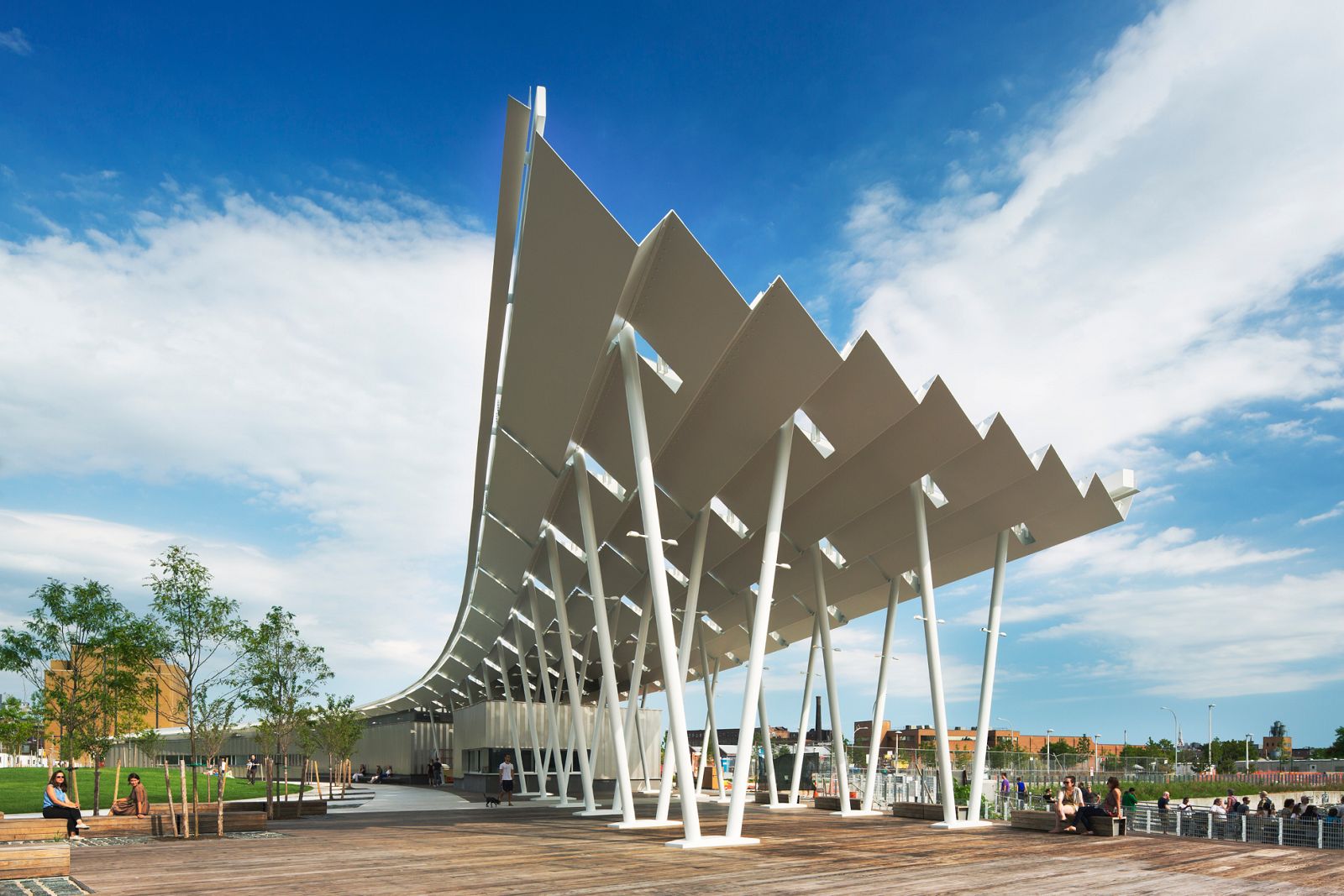 A curved pavilion frames the southern edge of the lawn and extends to form a pleated steel canopy, providing shade for an outdoor café and framing a powerful view across the river to the Empire State Building.