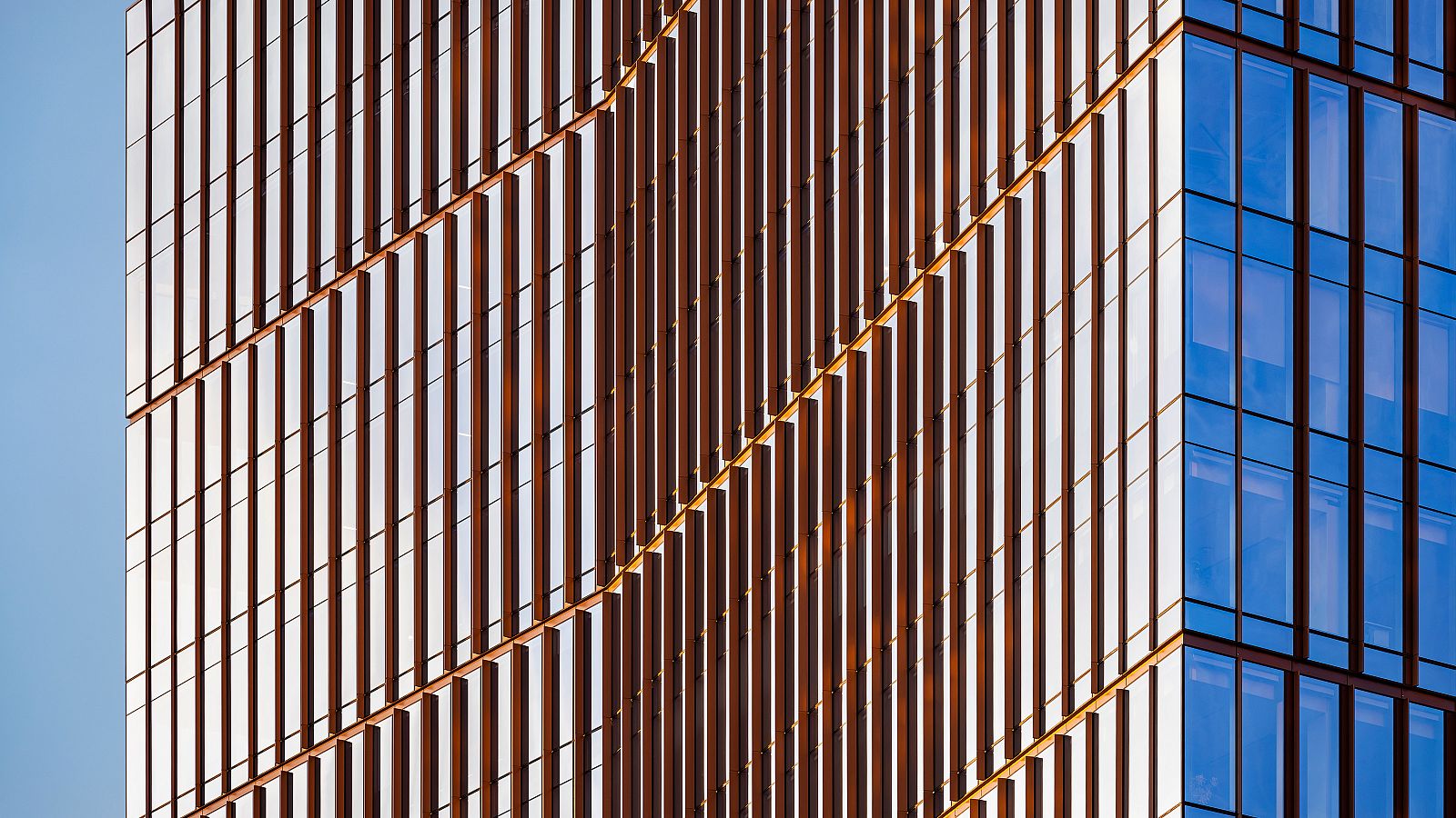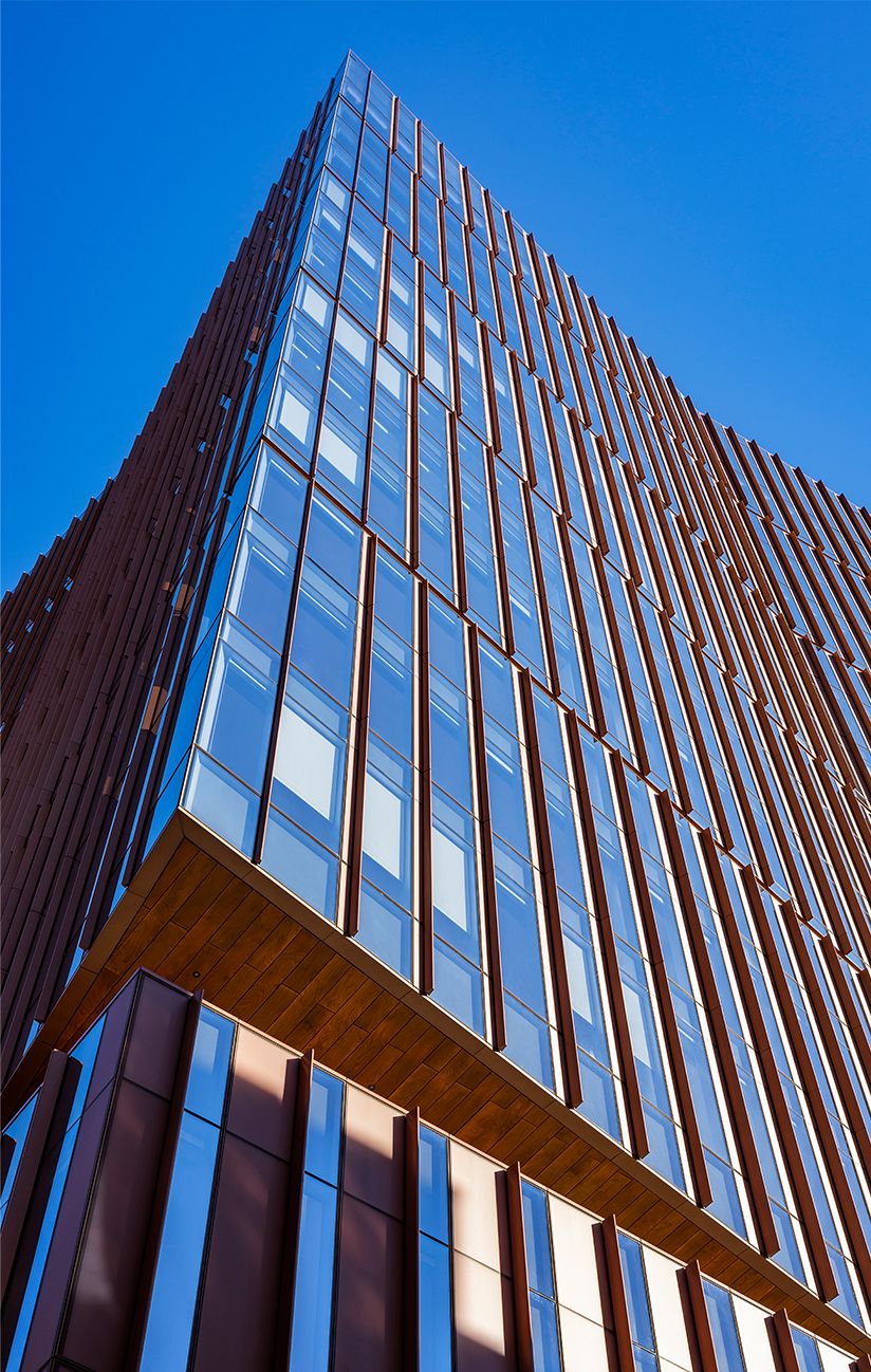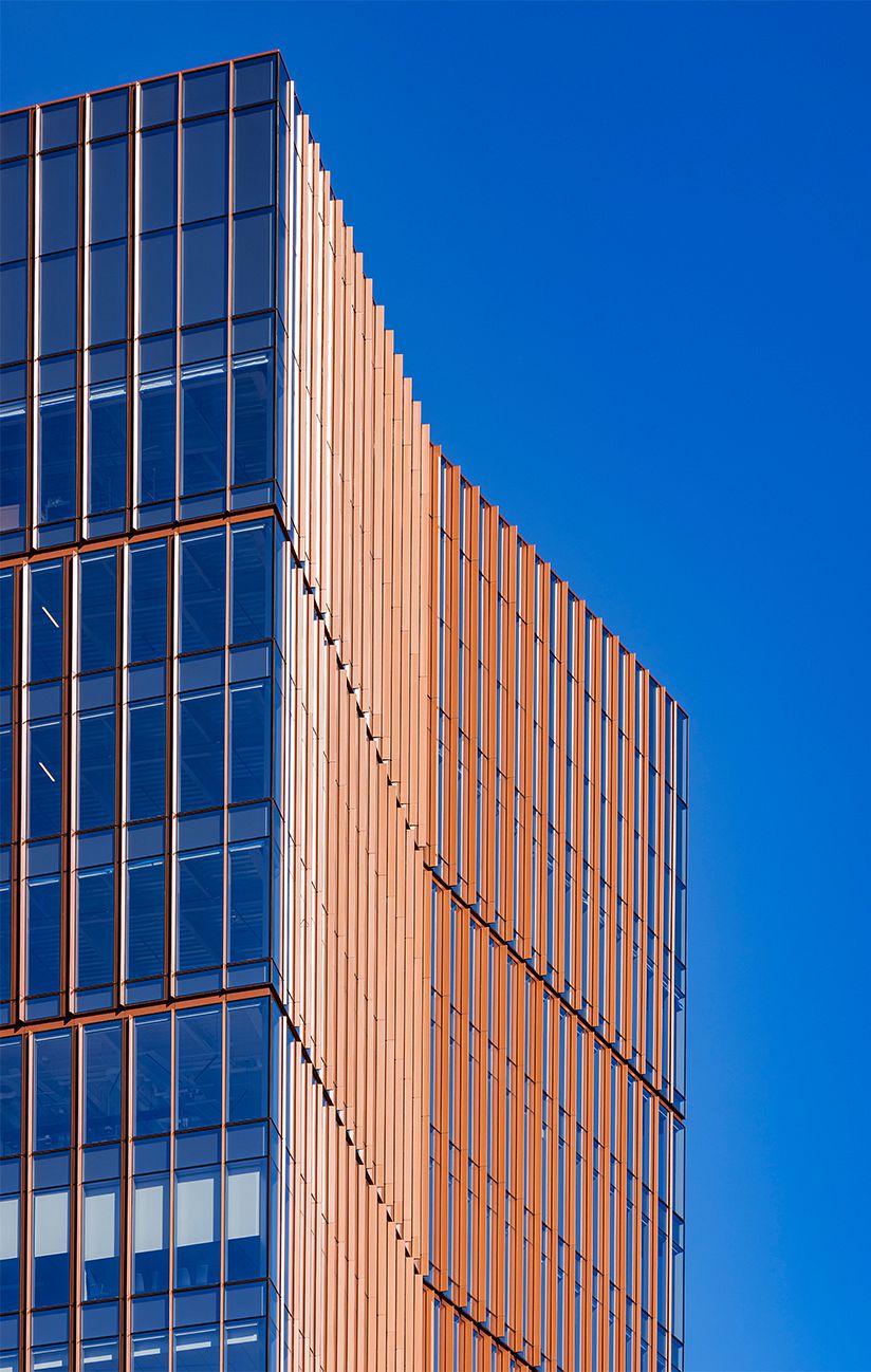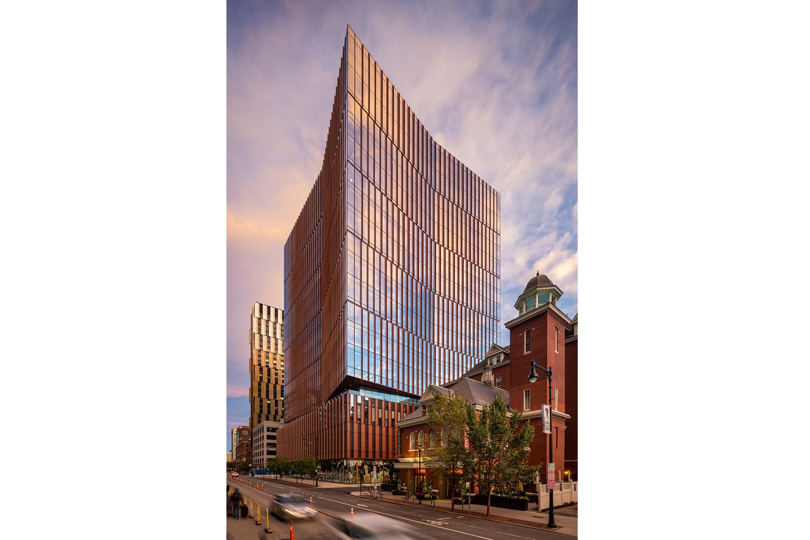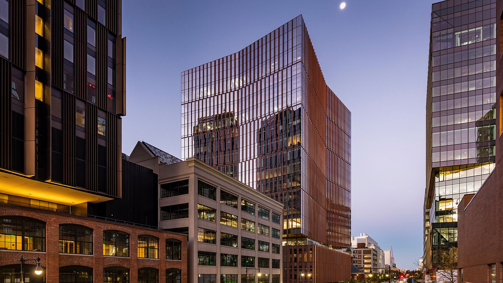 The building's massing reflects its distinct programs: street-level retail and museum spaces are nested below a 4-story plinth. A faceted tower above accommodates open-floor work areas for a mix of established research-focused companies and startups. The scale of the plinth relates to Kendall Square's low-rise historic neighborhood and the design of its exterior, articulated by a sequence of terracotta-colored opaque and transparent glass panels, communicates chromatically with its surroundings.