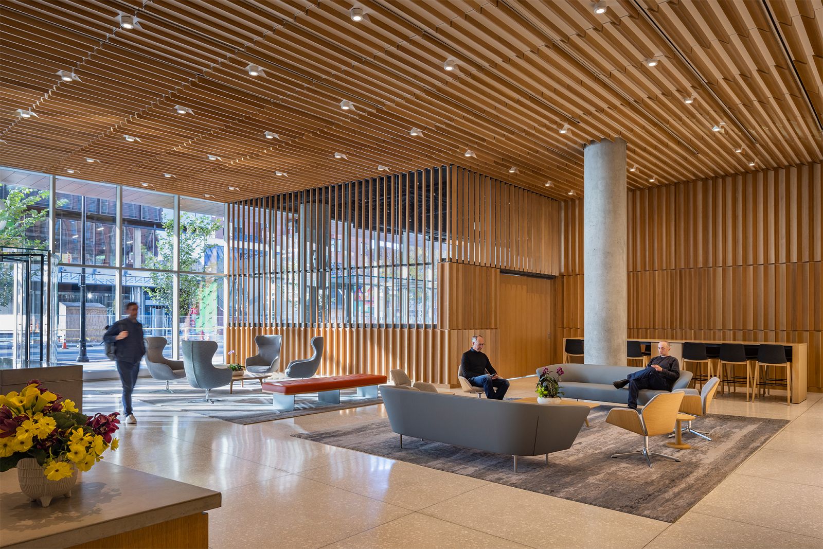 The building's glass facade is characterized by a shifting ceramic frit pattern that mediates the transition between the lower and upper floors. The highest transparency is reached on the upper tower levels, which feature ample access to natural daylight and panoramic views of the Boston skyline. Expansive open-floor plans and generous ceiling heights provide loft-like flexibility.