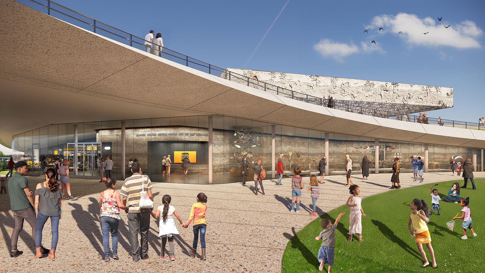 Framed views throughout the park and museum bring into alignment the research and museum collection that contains over 3.5 million specimens. As flexible armatures, loops and lenses connect and reveal, forming a continuous journey that tells the story of La Brea Tar Pits and Page Museum: the continuum from prehistoric time to our contemporary moment. The museum's treasures are revealed to visitors, bringing the museum to the park, and the park into the public imagination.