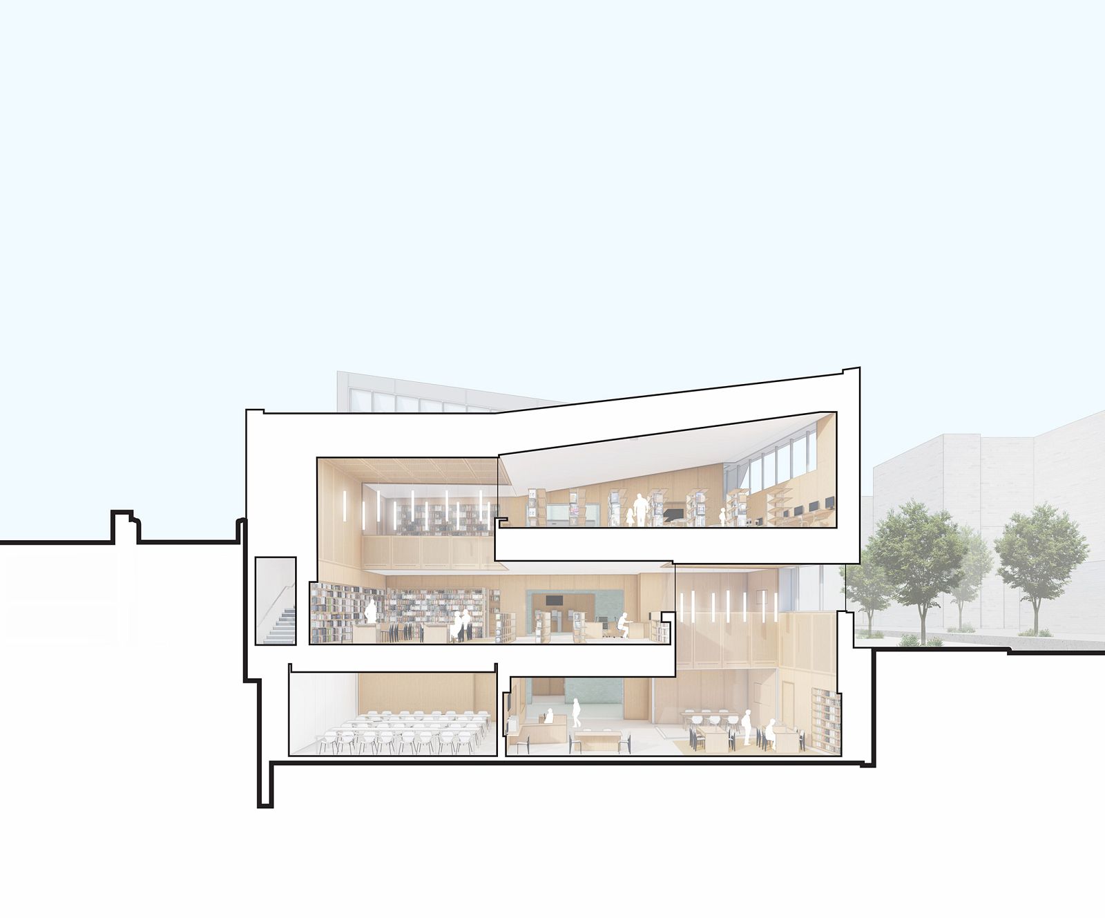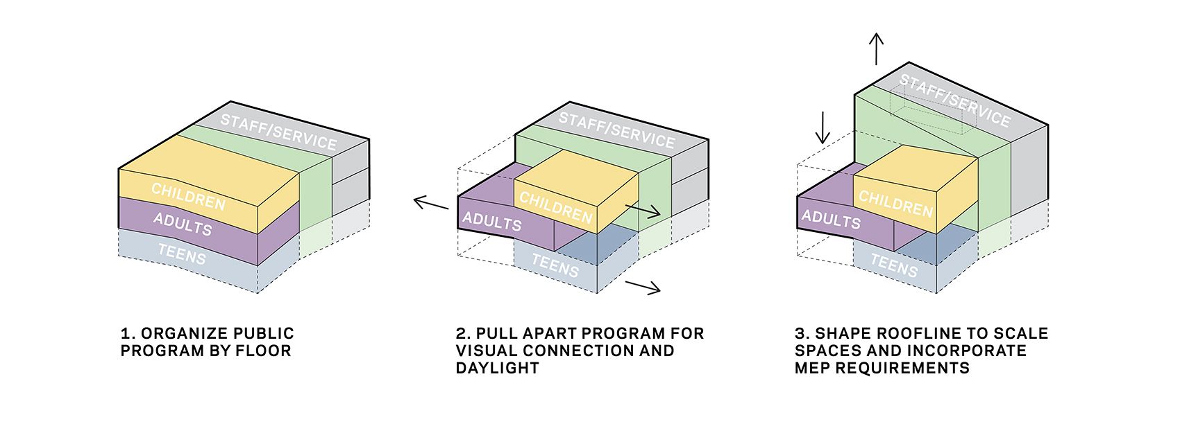The children's, adult, and teen reading rooms are stacked in section but shifted apart in plan. This allows for acoustic separation between the library sections but creates visual connections. The library separates its program into two major volumes: public areas on the east side along 63rd Drive, and staff and service areas on the west side along the property line. The two sides of the building are linked with a central "wedge" of circulation including a generous entry vestibule and a monumental stair. The shear between the two volumes of the building creates a tall clerestory at the central stair, bringing natural light deep into the building.