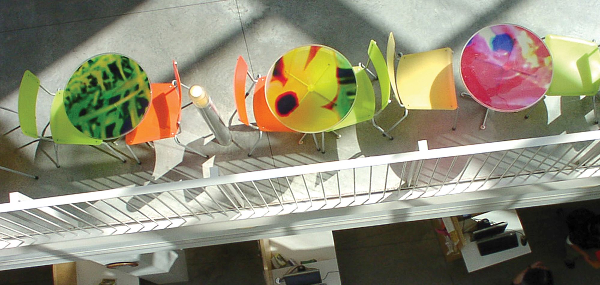 Another example would be the furniture at Smith College Student Center. Smith College actually contains a highly recognized arboretum. We took photos of some of the more spectacular botanical elements at Smith, and had those photos embedded within a series of tables. These were printed on transparent plastic and then embedded halfway into a 1-inch pour of resin. We also had the Latin, the indigenous, and common names of the plants inscribed in the image. The intention is not a literal depiction of the botanical element, but an artistic reinterpretation that helps further define the sense of place. We also wanted to play with luminosity: the tabletops are intentionally translucent. Located along the pathway under the skylight, the tabletops become conduits that help draw natural light through the building.