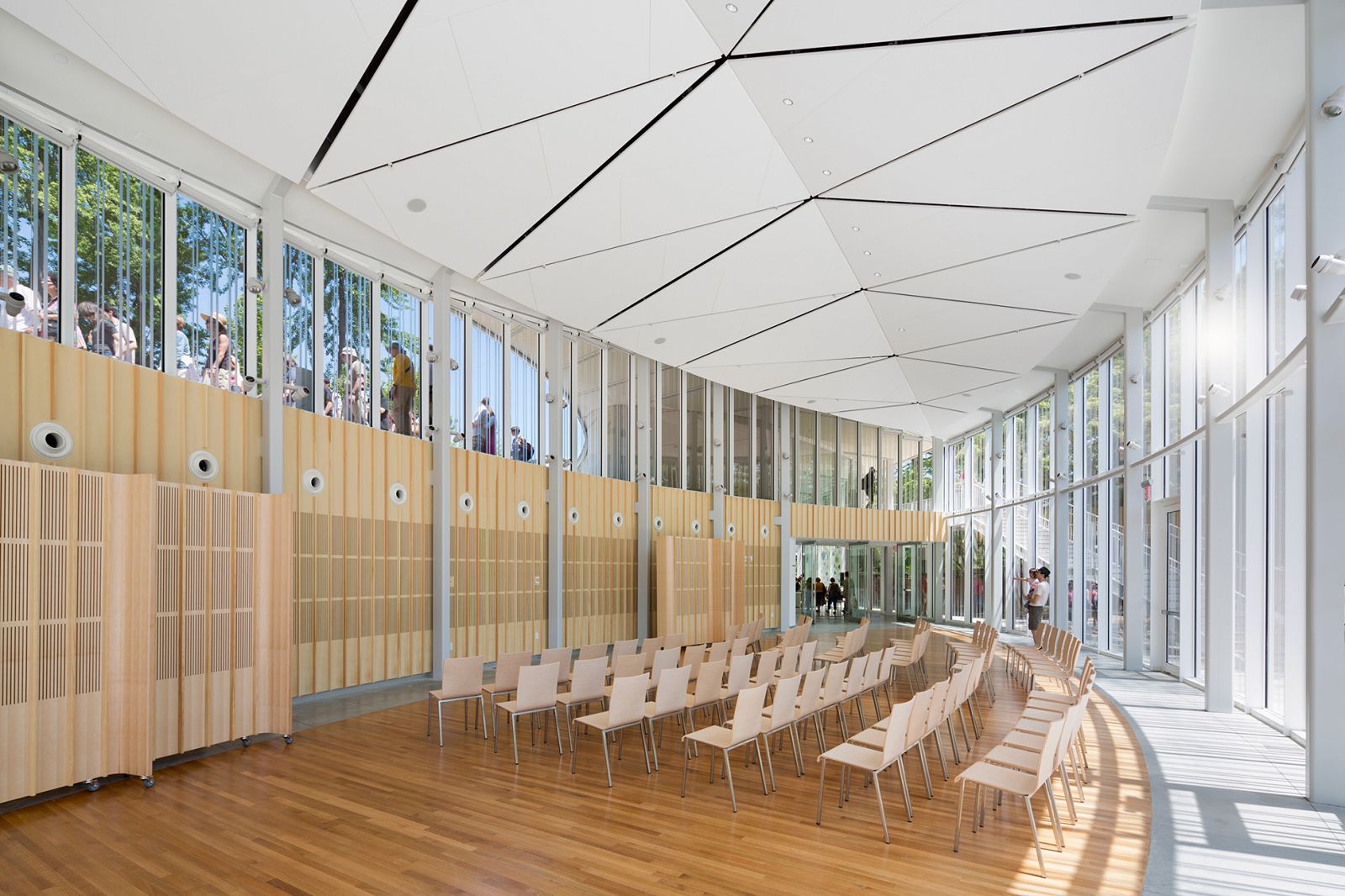 A similar example: the few Gingko trees that were removed to make space for the Brooklyn Botanic Garden Visitor Center were used to make part of the acoustic wall inside the Visitor Center’s Event Space. The wood also became part of the panels used for mobile furniture and partitioning. Here, the marriage between architecture and furnishings was very much an intention. The relationship between furniture and the larger setting has always been important to us.