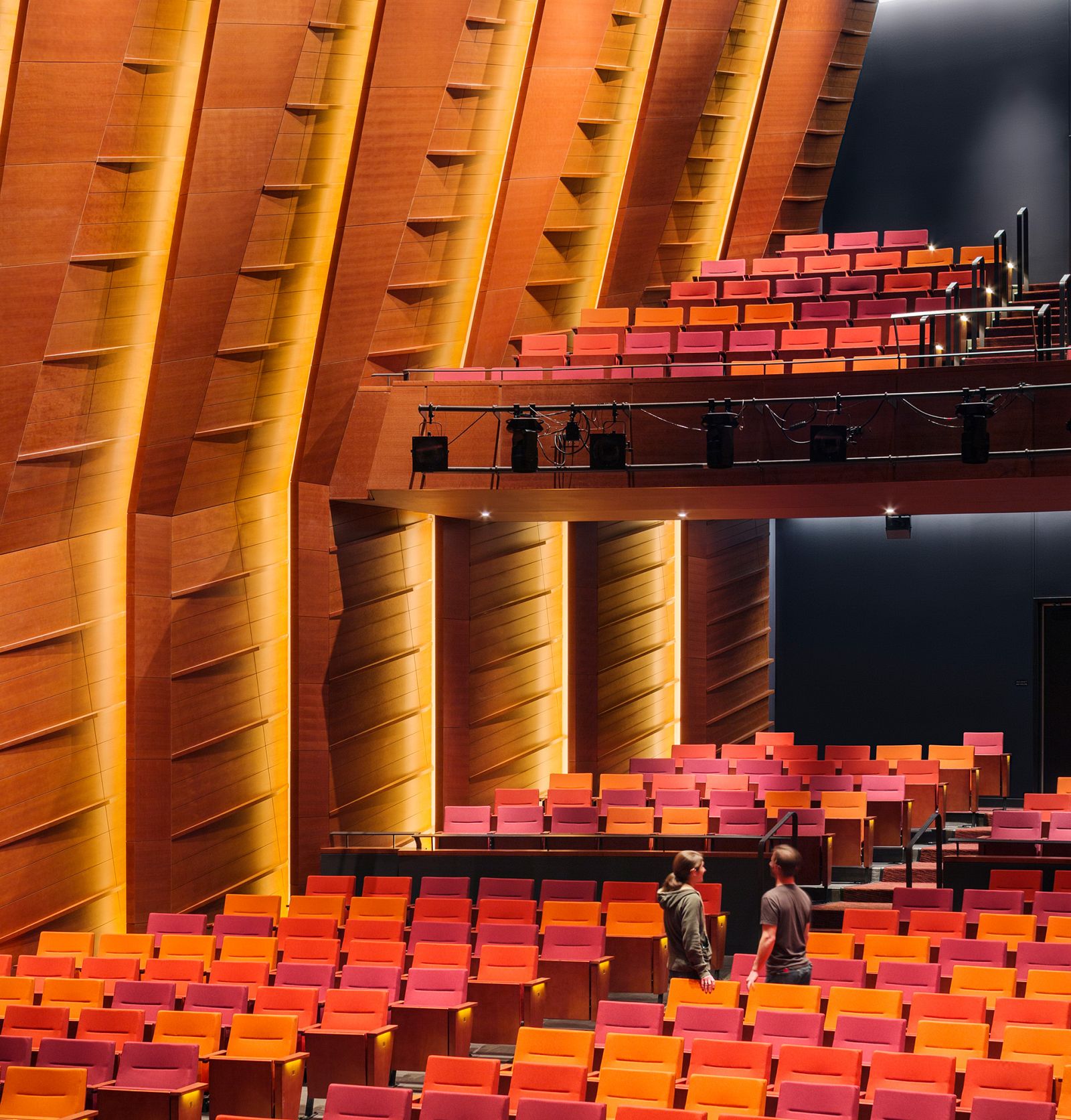 Furniture can offer a space personality. For instance: in designing a theatre auditorium, like the one at Marshall Family Performing Arts Center, we were interested in not having just one monolithic seating color. We might arrange a collection of colors that, together, populate the space. Even in the absence of a full audience, someone looking out from the stage at the audience might see a diversity of the chroma and experience an intuitively welcoming and populated space.