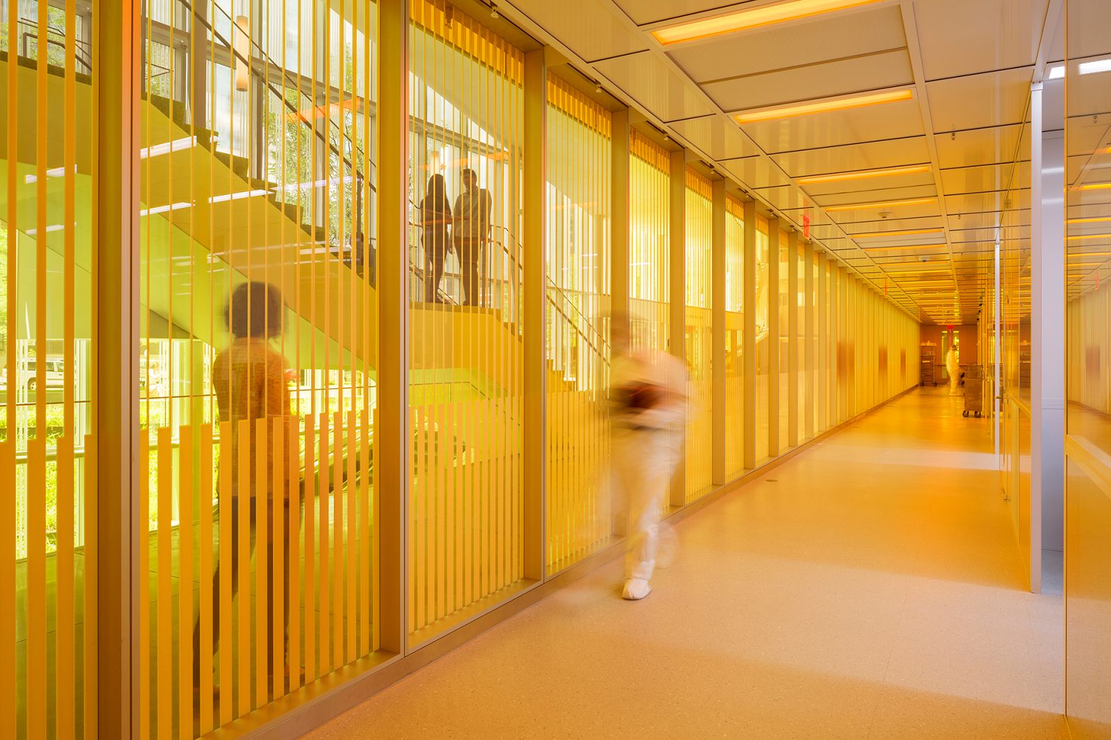 We are also aware of the material resonance of our thinking about the furnishings. At the University of Pennsylvania’s Krishna P. Singh Center for Nanotechnology, the translucency of the amber glass protects the research inside. We wanted to bring that luminosity of amber into relation with the people outside of those spaces. This polished amber resin is completely transparent on the side, and yet on its surface there is a very soft etching with a soft sand to show how one material can take on many lives.