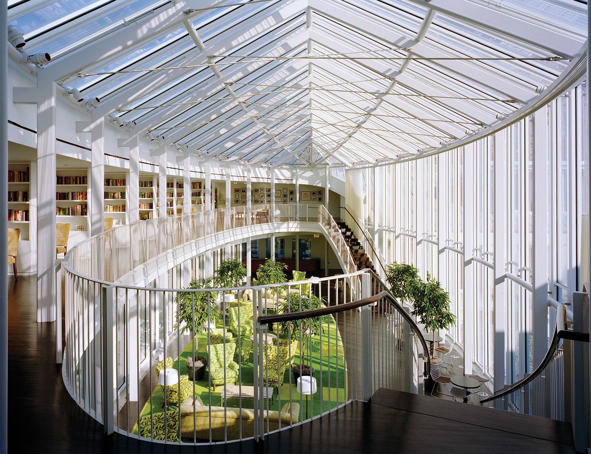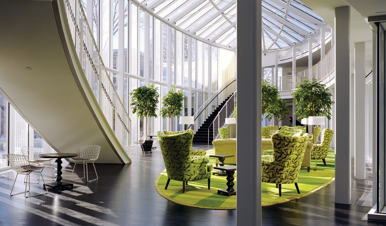 There are two approaches equally valid approaches to color: one where color is assertive and becomes a kind of counterpoint to its environment—it’s the gregarious individual in the space. In this approach, color is much more foregrounded, and it may be used as a counterpoint to a more neutral envelope. The other approach might, like at the Greentree project, recall a landscape that exists in close proximity—in this case, many different shades of green that recall the surrounding environment. Here, color allows for the landscape to be brought into the interior.