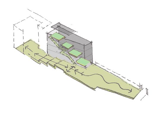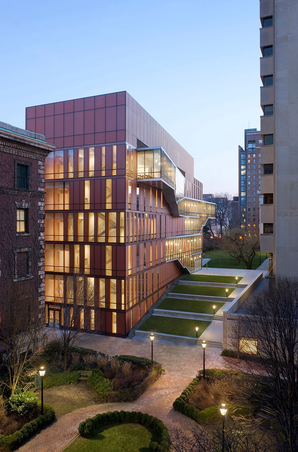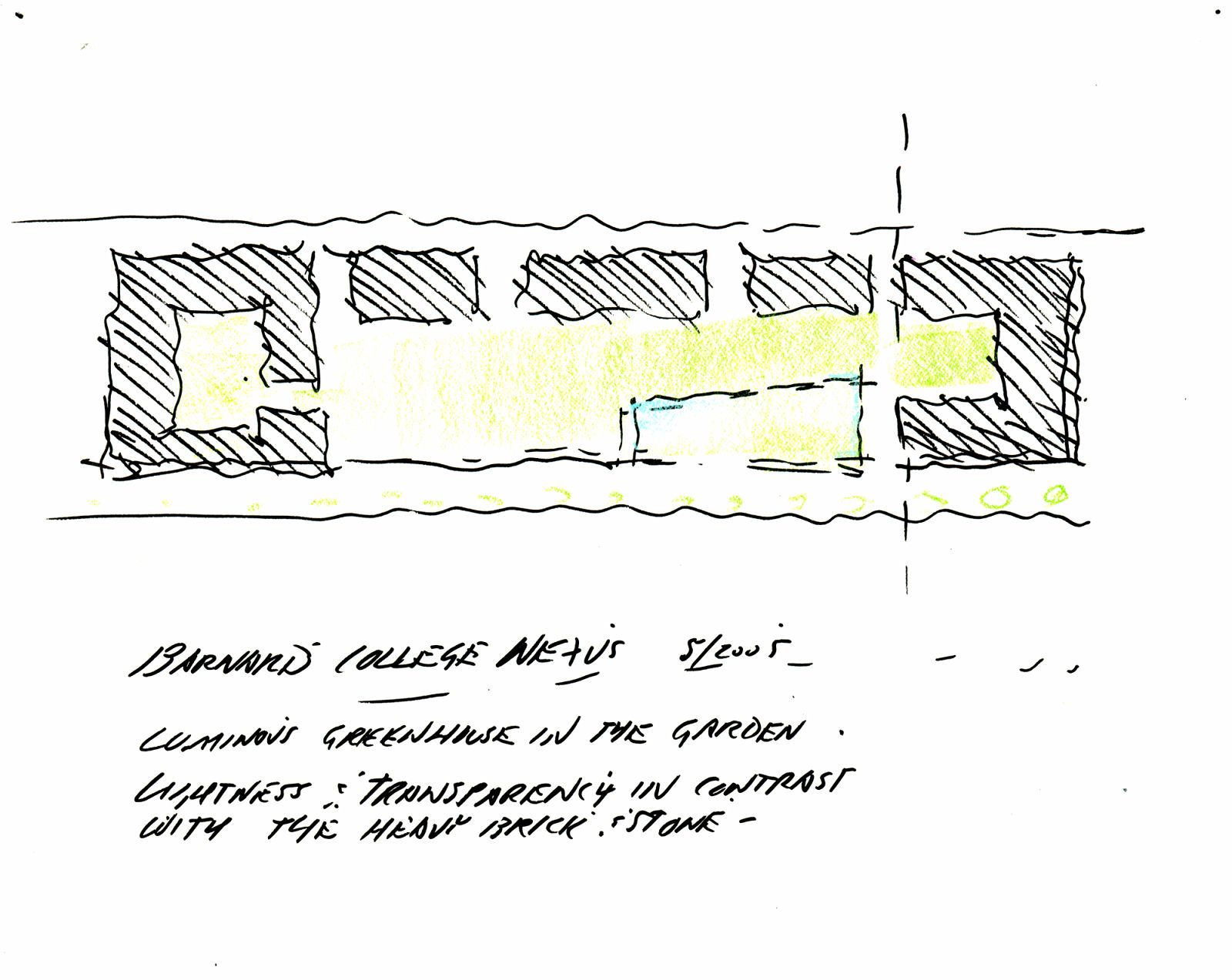 The wedge-shaped configuration provides a new presence on Broadway and its ascending terraces connect the previously separated landscapes at Barnard College.