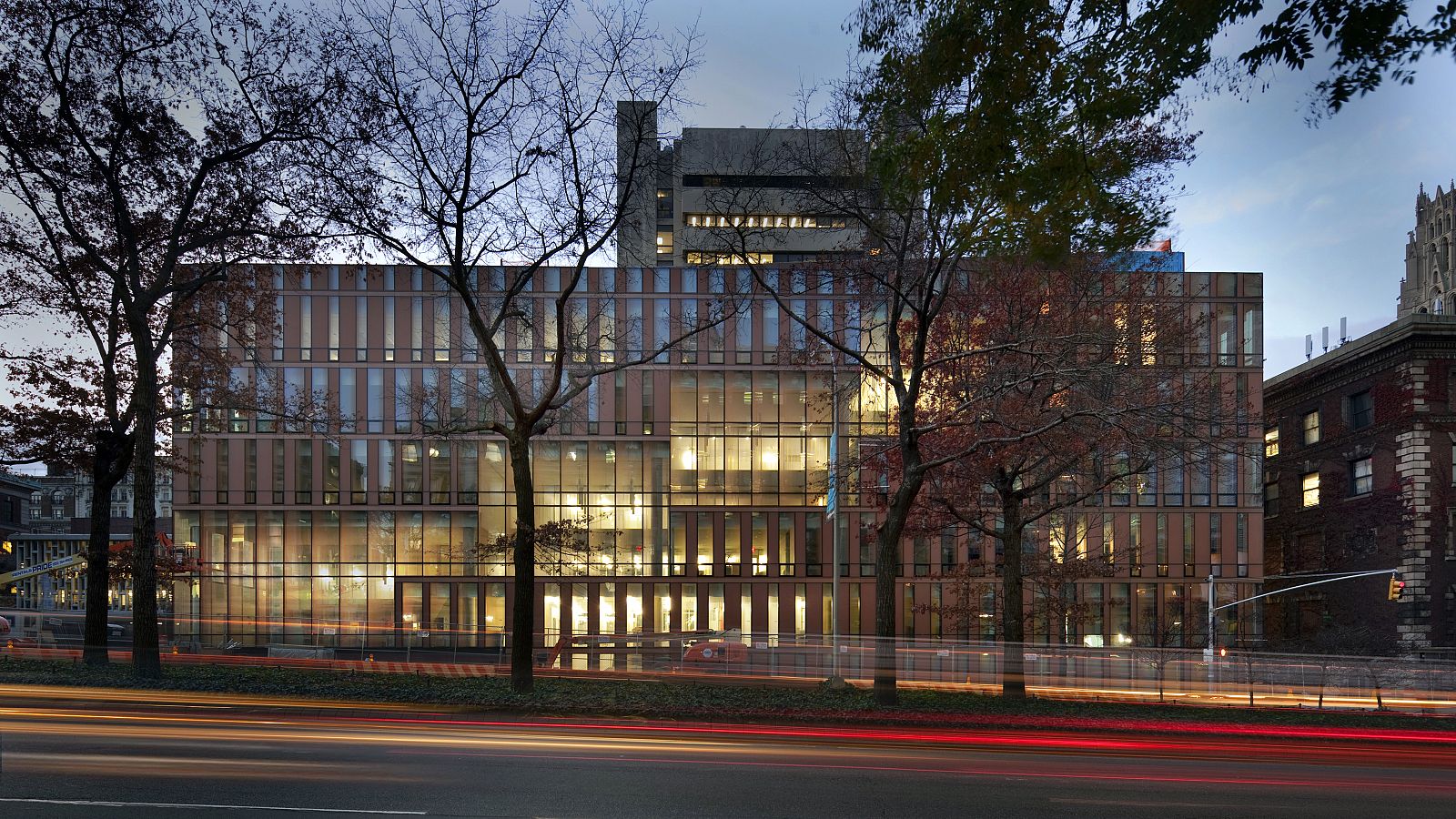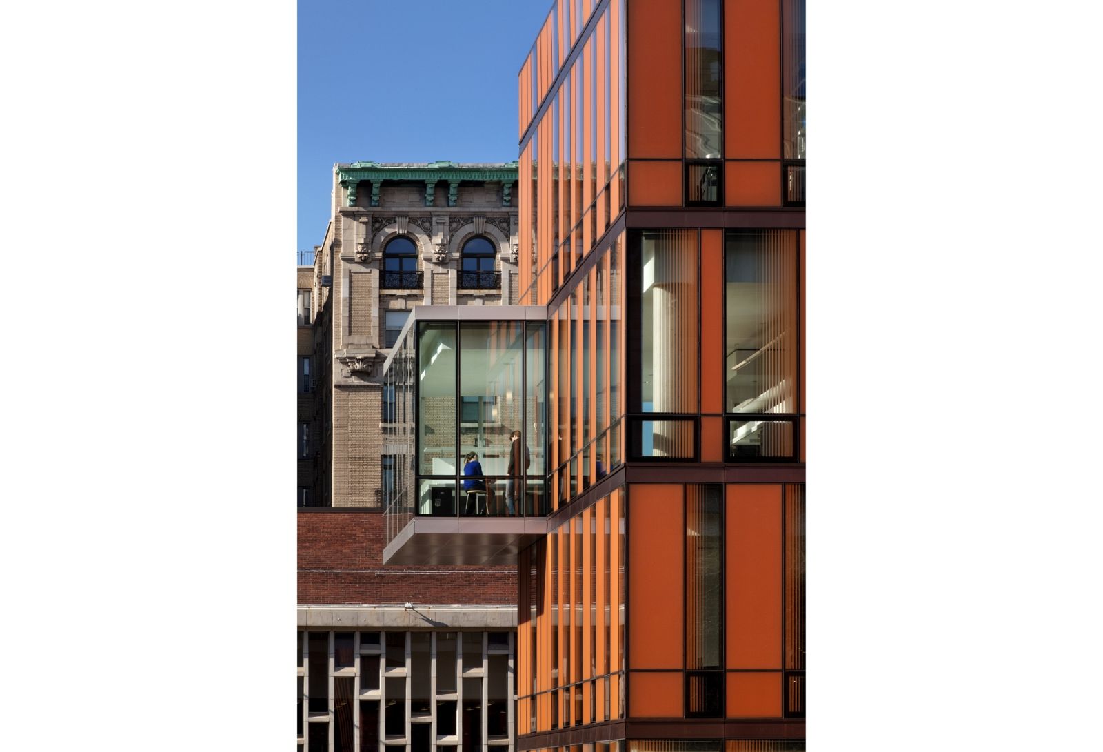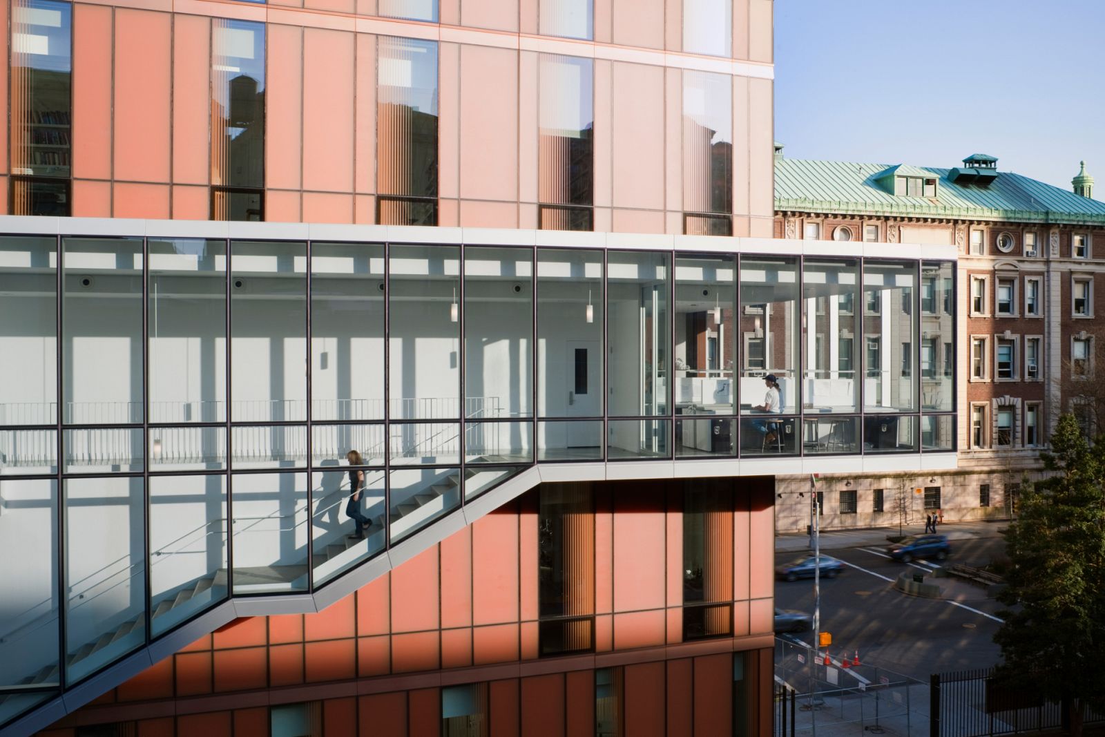 Winner of a national design competition, a AIA National award, and a Progressive Architecture award, the Diana Center establishes a new nexus for social, cultural, and intellectual life at Barnard College. Located on Broadway, the multiuse arts center unites landscape and architecture, interior and exterior in a seven-story building with ascending double-height glass atria and an unfolded glazed staircase that bring in natural light and eliminate visual boundaries between the college and the city. Carving a diagonal void through the building, the slipped atria create views through diverse program spaces and visually connect Lehman Lawn to the upper floors of the building and the green roof. The facade—composed of 1,154 clear and color integral glass panels—translates the brick and terracotta of the surrounding neighborhood into a luminous, energy-efficient exterior.