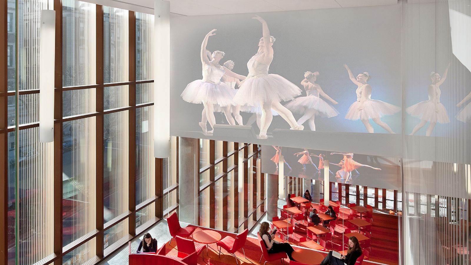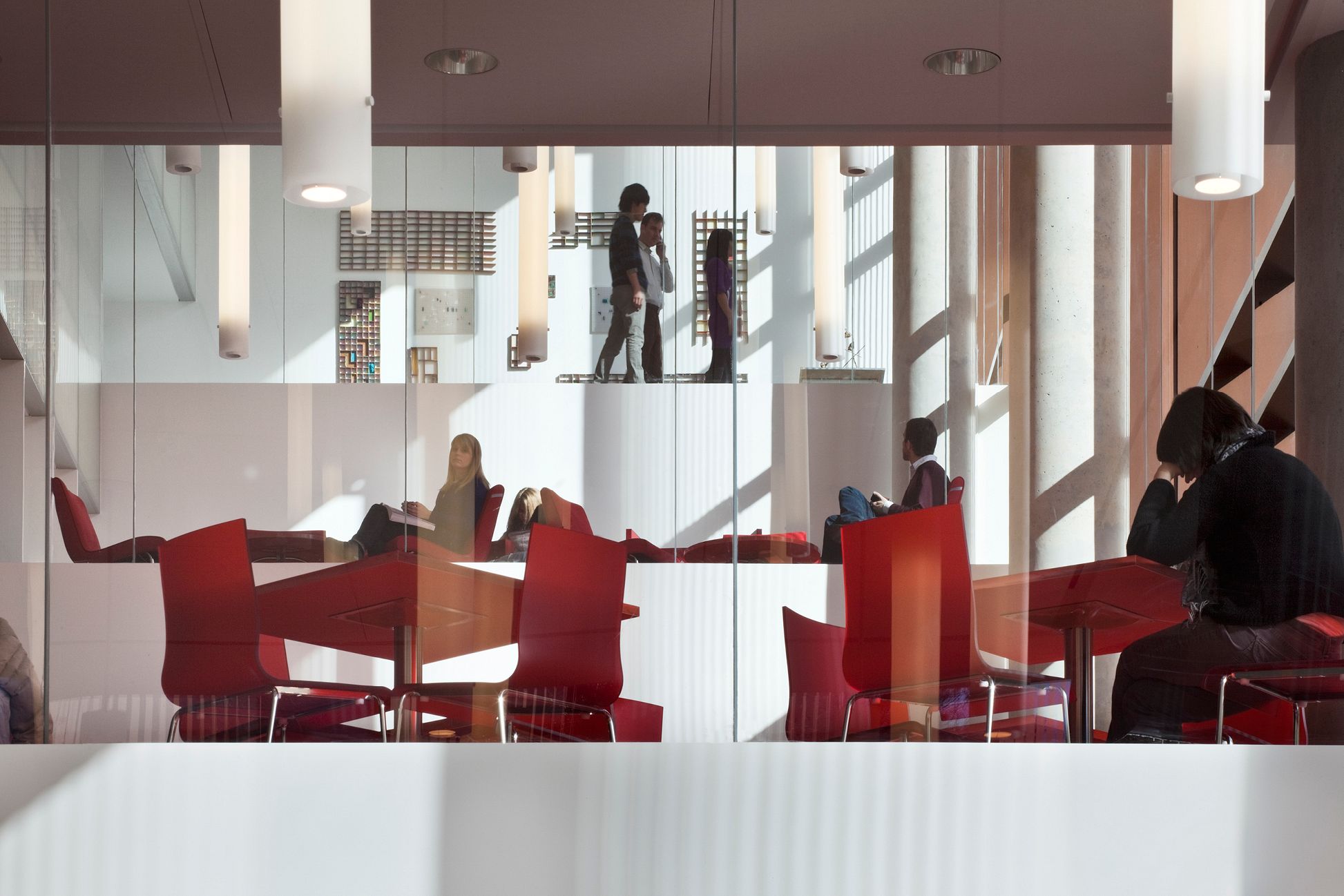 Envisioned as an innovative center for campus life, the 98,000-square-foot building features dynamic layering of previously separate functions. The program includes architecture and painting studios, a 500-seat performance space, black box theater, cafe, dining room, reading room, classrooms, and exhibition galleries.