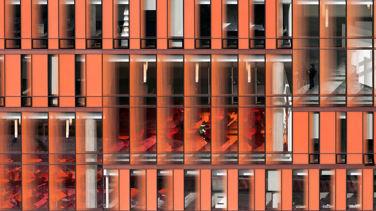 The building’s innovative enclosure establishes a reciprocal relationship between the campus context and the diverse program elements within the building.