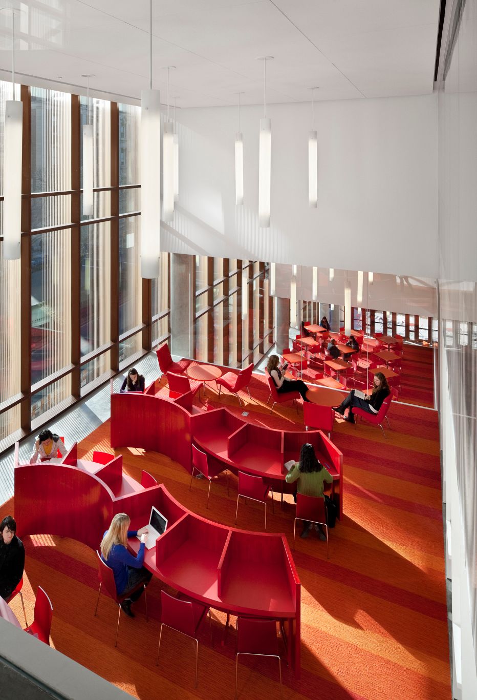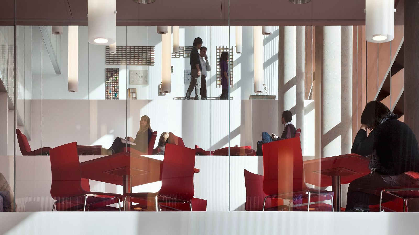 The diverse programs of the building open to the light-filled atria and are connected by a series of ascending public stairs on the campus side of the building.