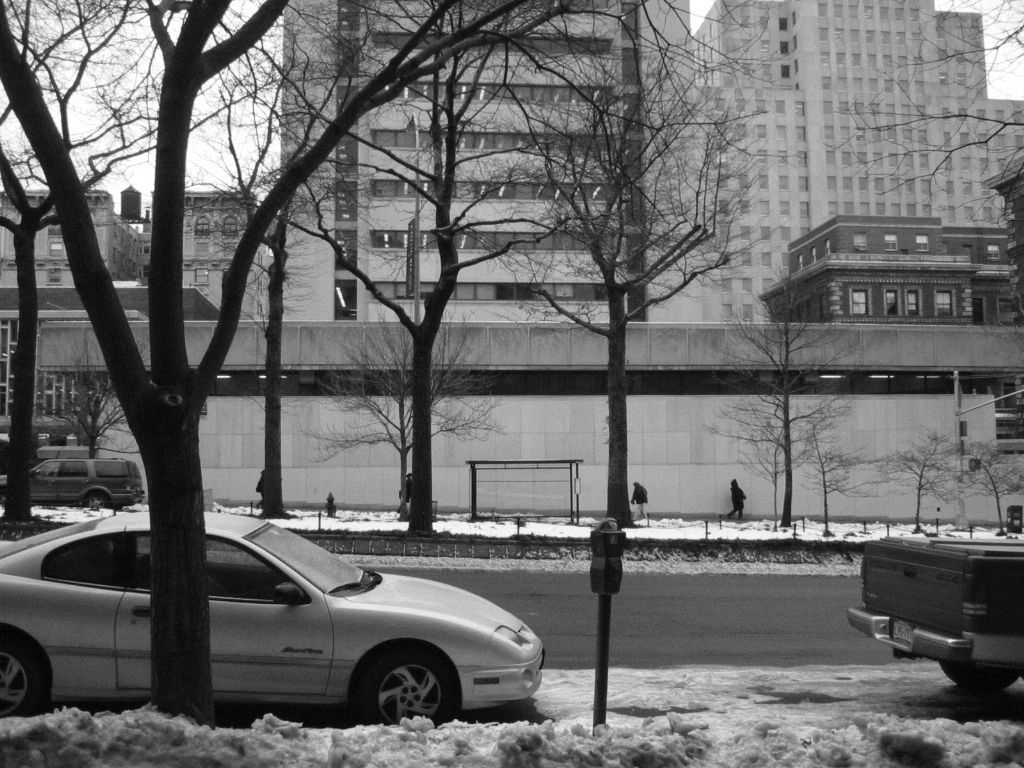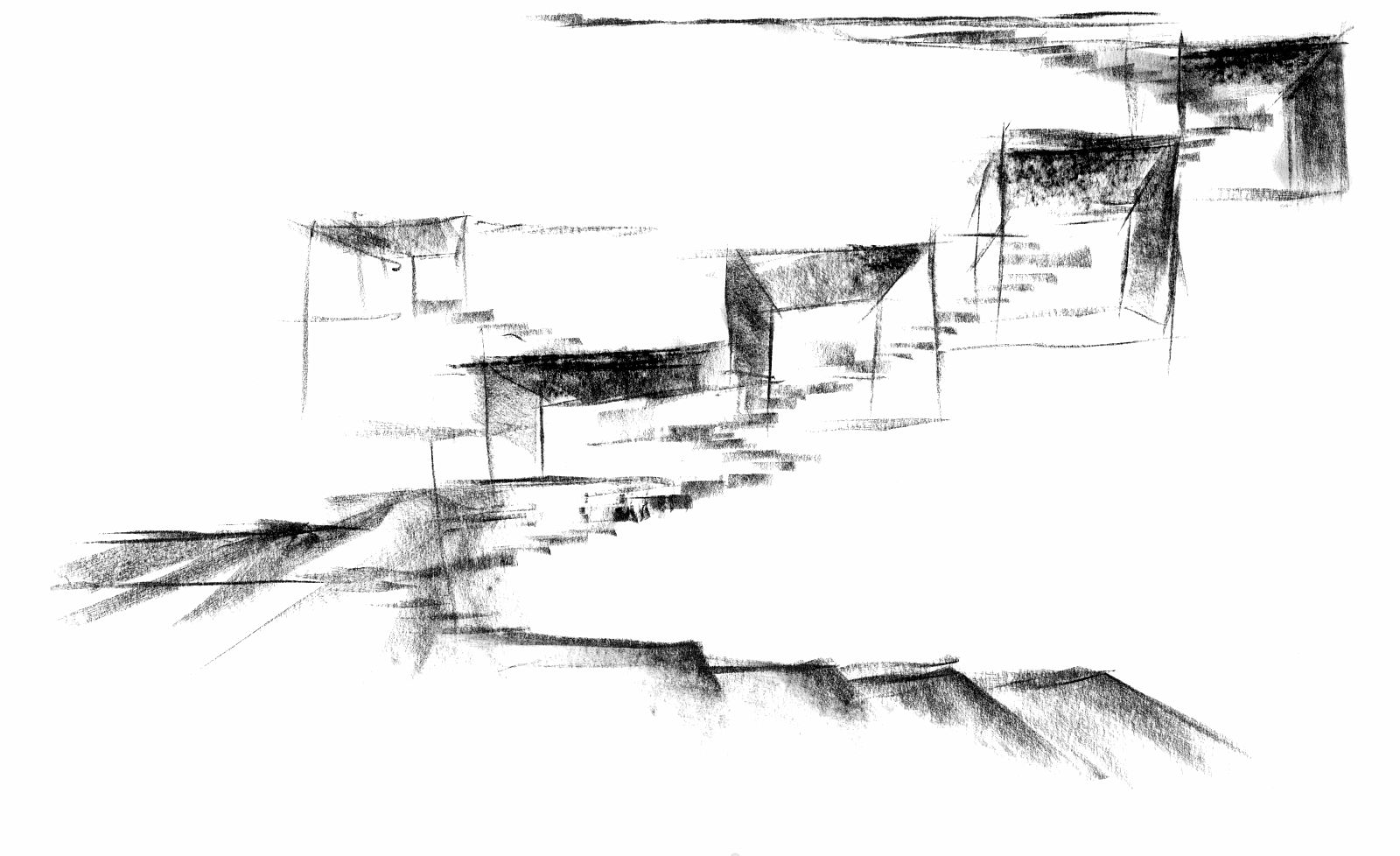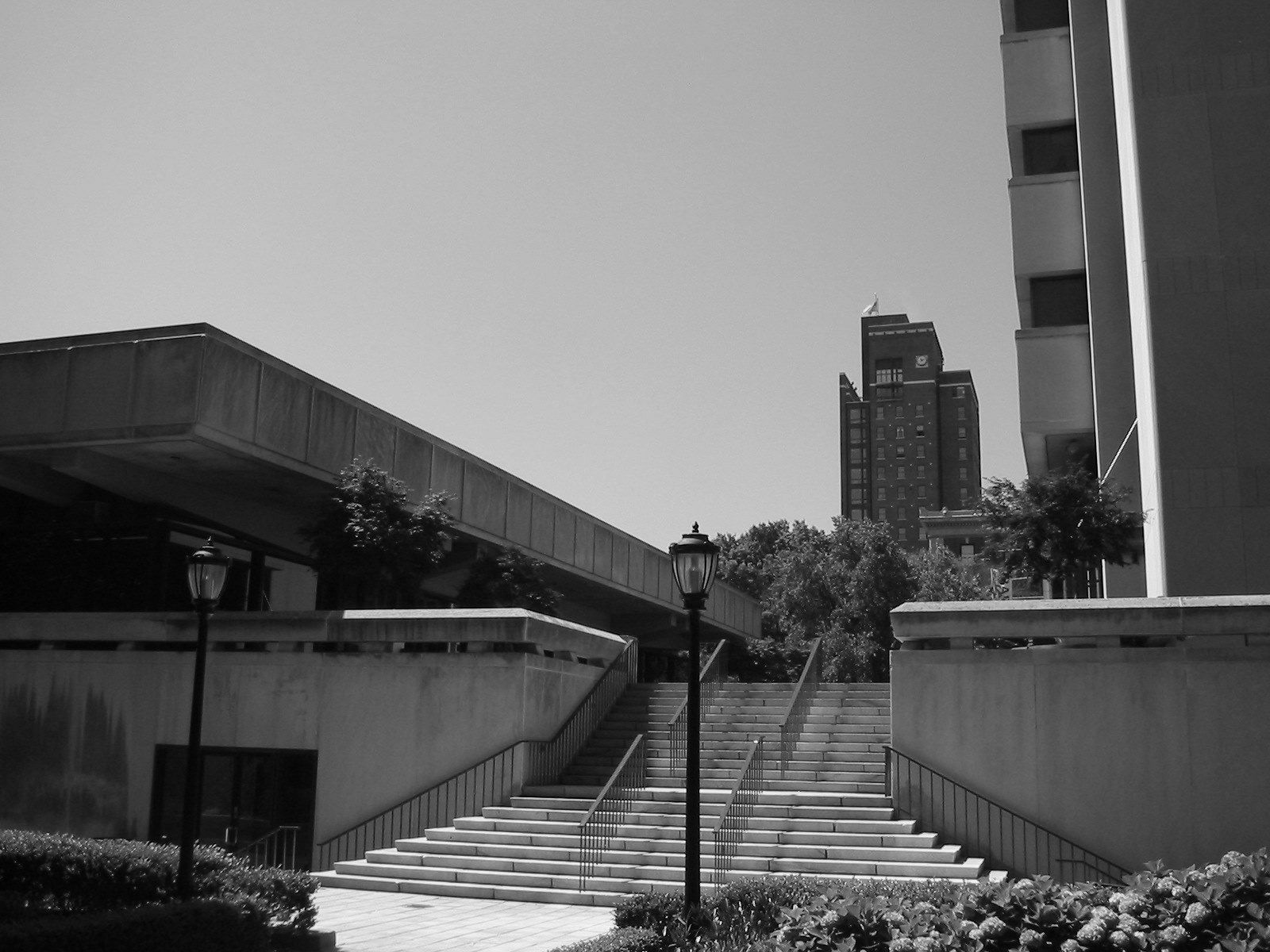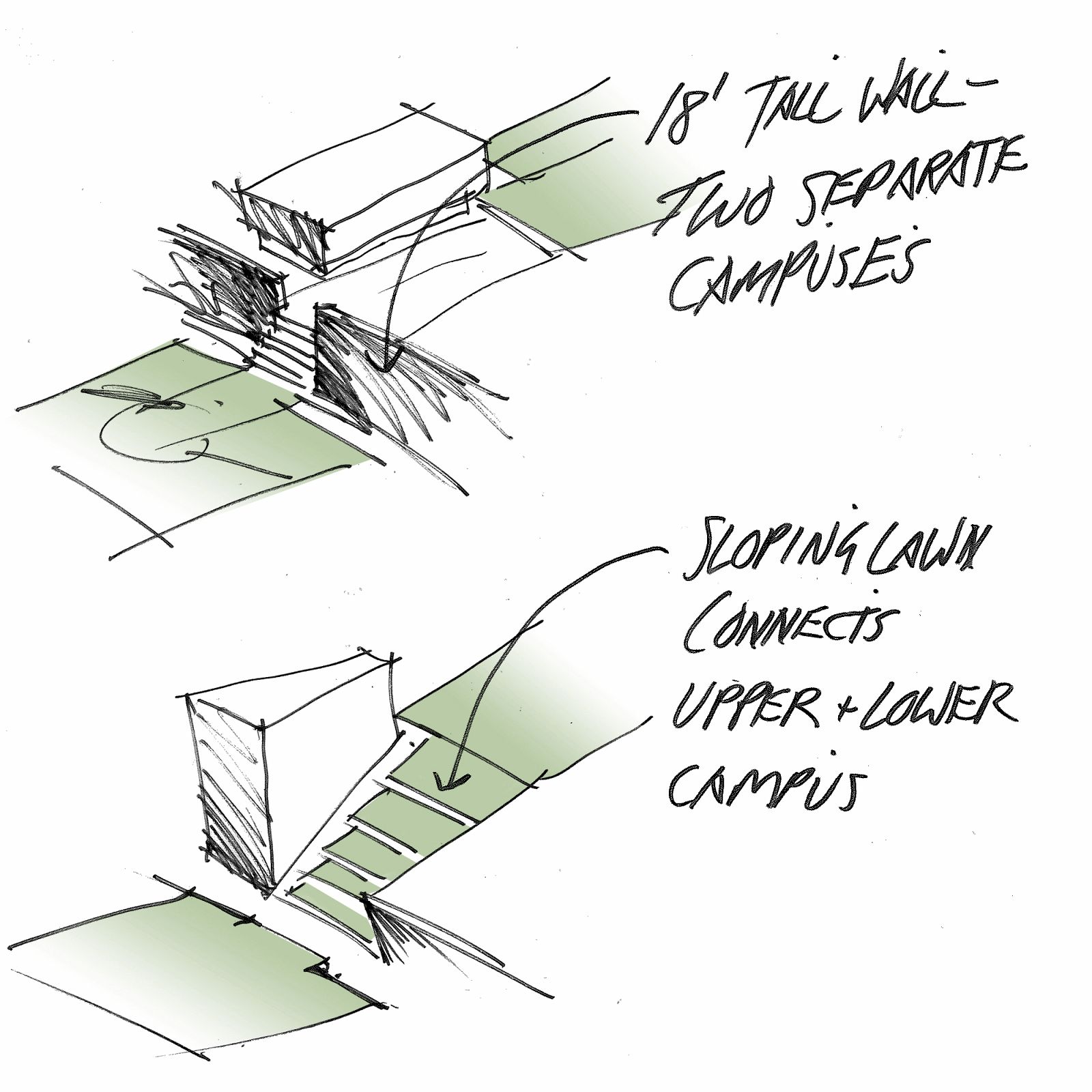 The fourteen-level change of the existing site divides the north and south campus lawns. The Diana Center's ascending terraces connect previously separated landscapes.