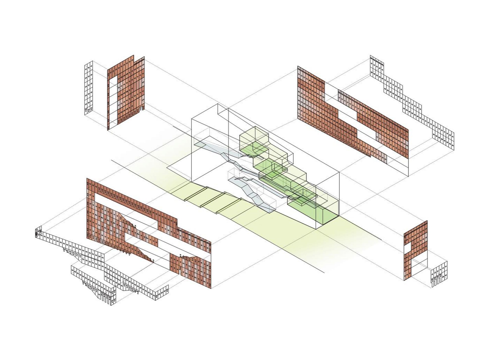 The glass panels of the facade translate the brick and terracotta of the surrounding neighborhood into a luminous, energy-efficient exterior.