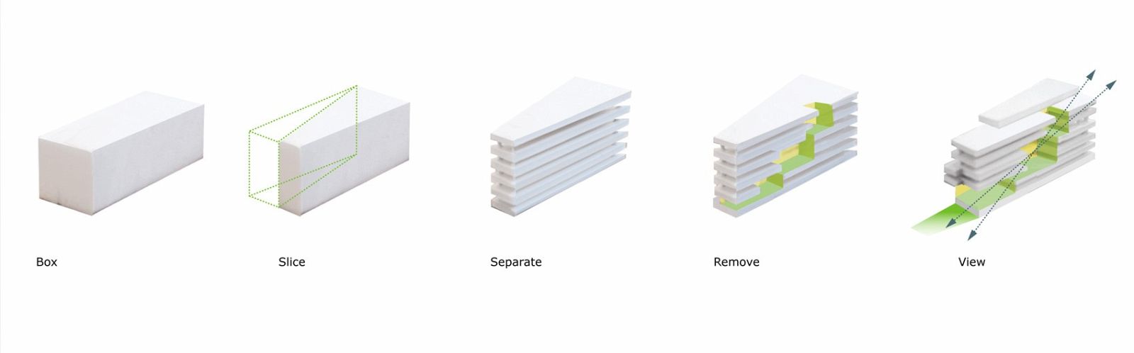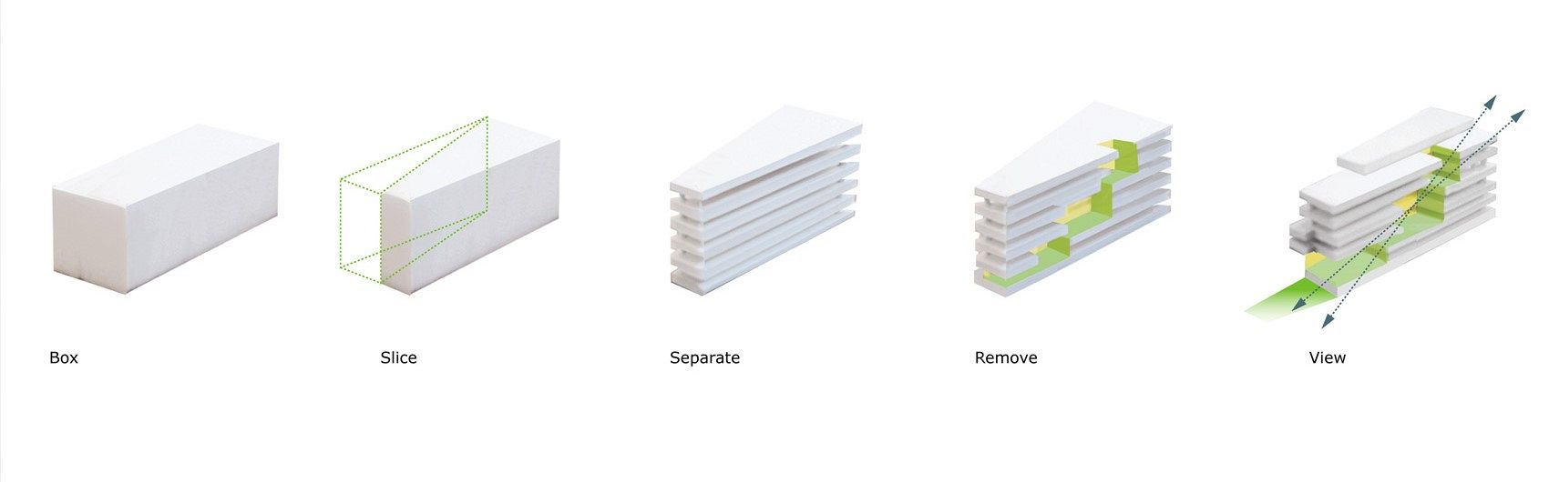 Carving a diagonal void through the building, the slipped atria create views through diverse program spaces.