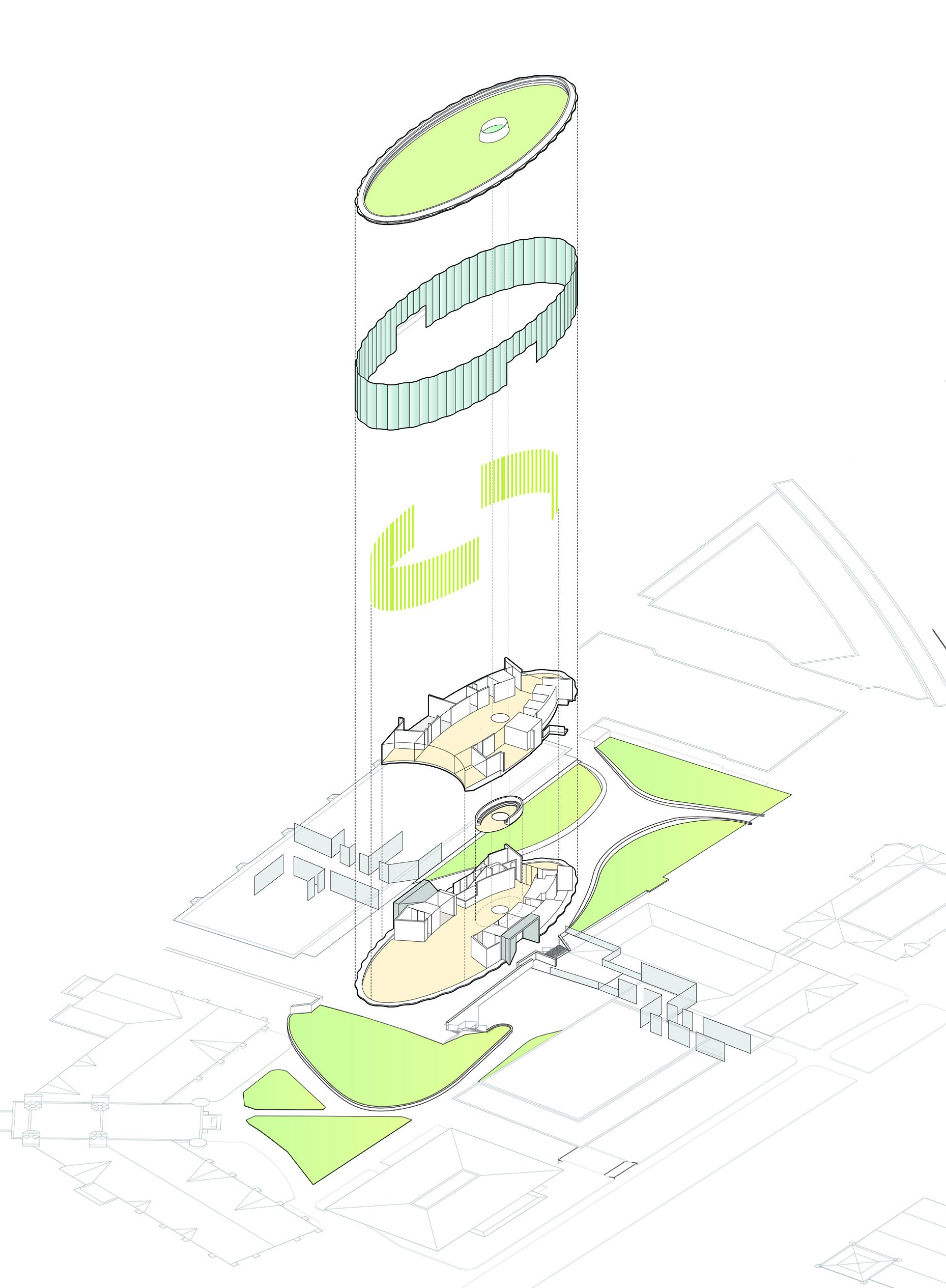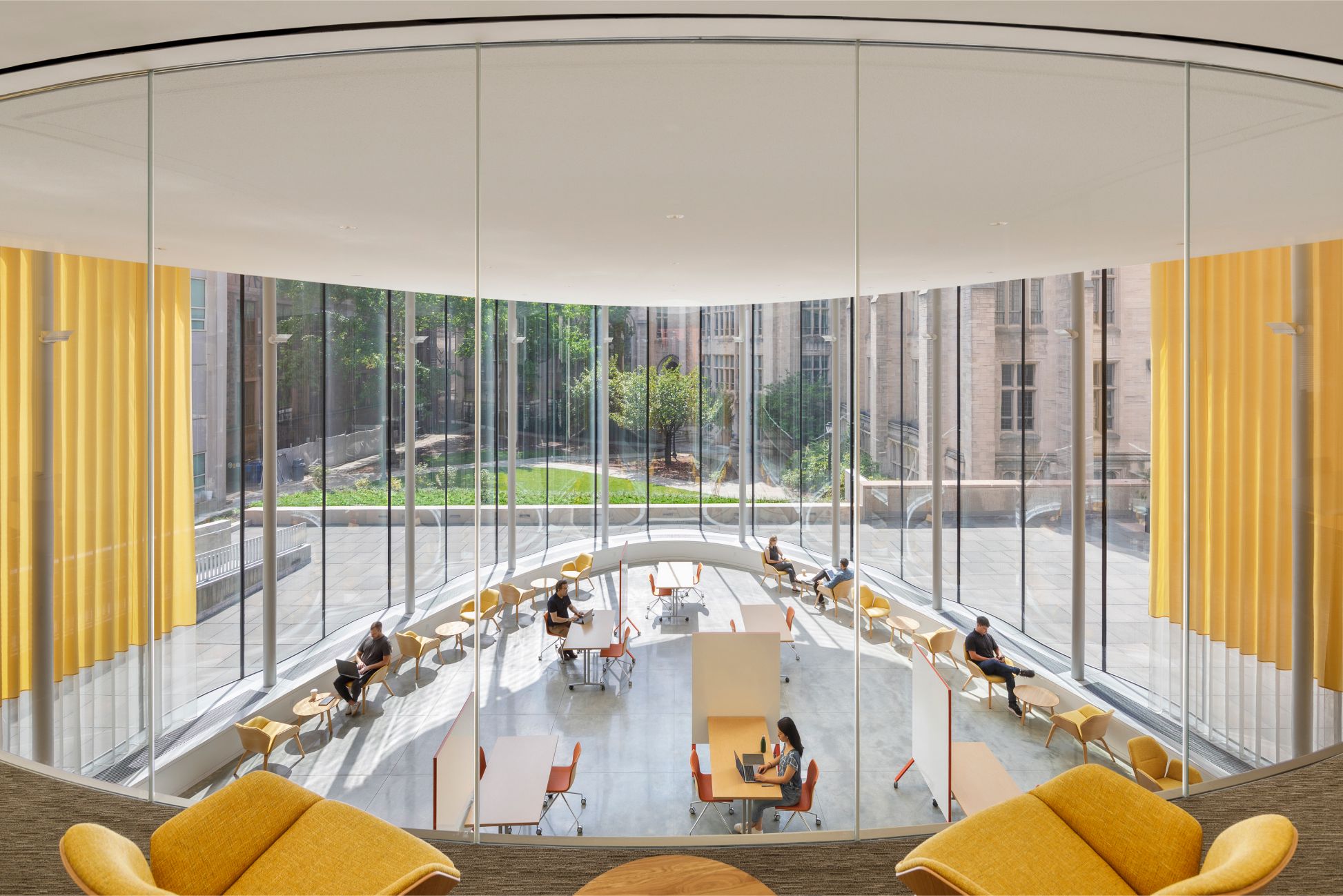 The multipurpose studio loft's elliptical group meeting spaces are centered around skylights at each floor level. The stacked skylights create a continuous line of sight between research spaces below the plaza and the sky above.