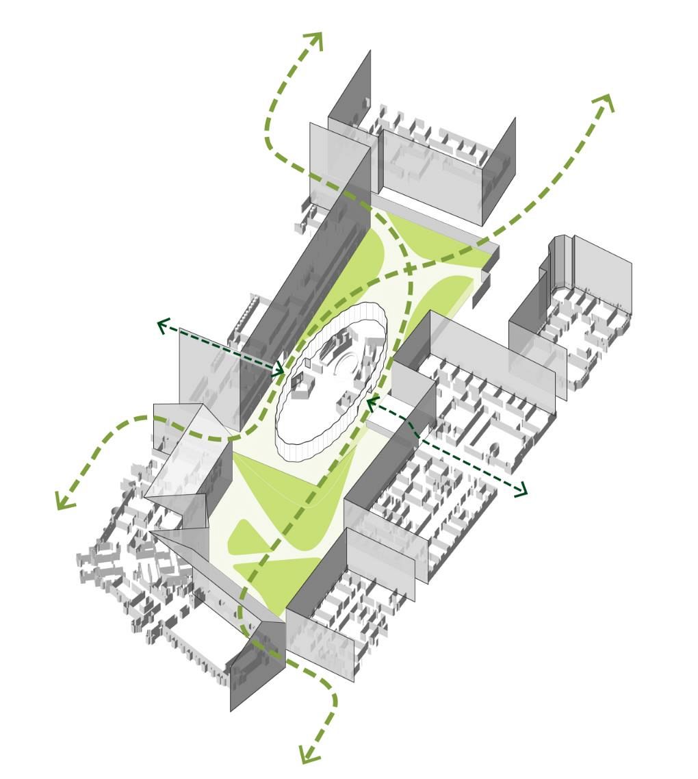 The building's elliptical form is centrally positioned in a courtyard of stepped orthogonal structures. Curved transparent glass walls encourage circulation through and around the Center, and allow the rest of the University to see and participate in ongoing work. Indoor and outdoor connections between the Center and the adjacent landscape establish this section of the campus as a new circulation route and a new home for innovation.