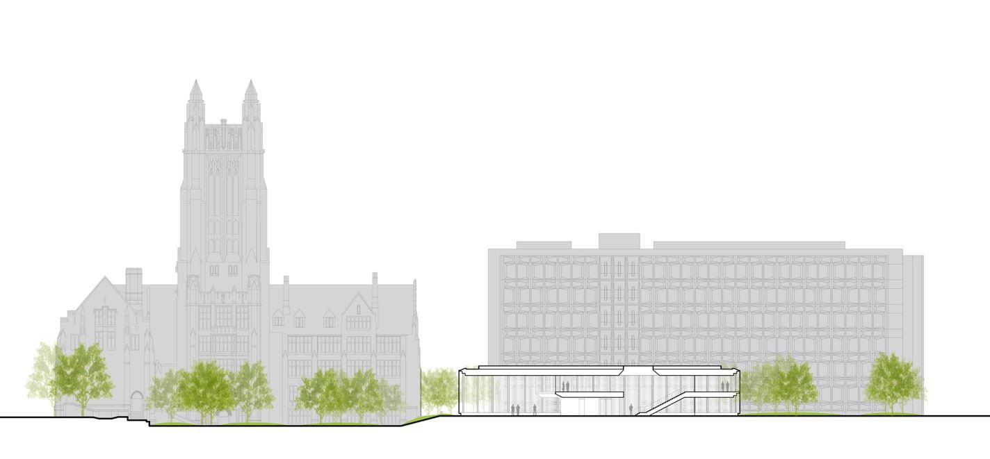 North-south section and view from Norris Courtyard situates the Tsai Center's relationship to historic surroundings.
