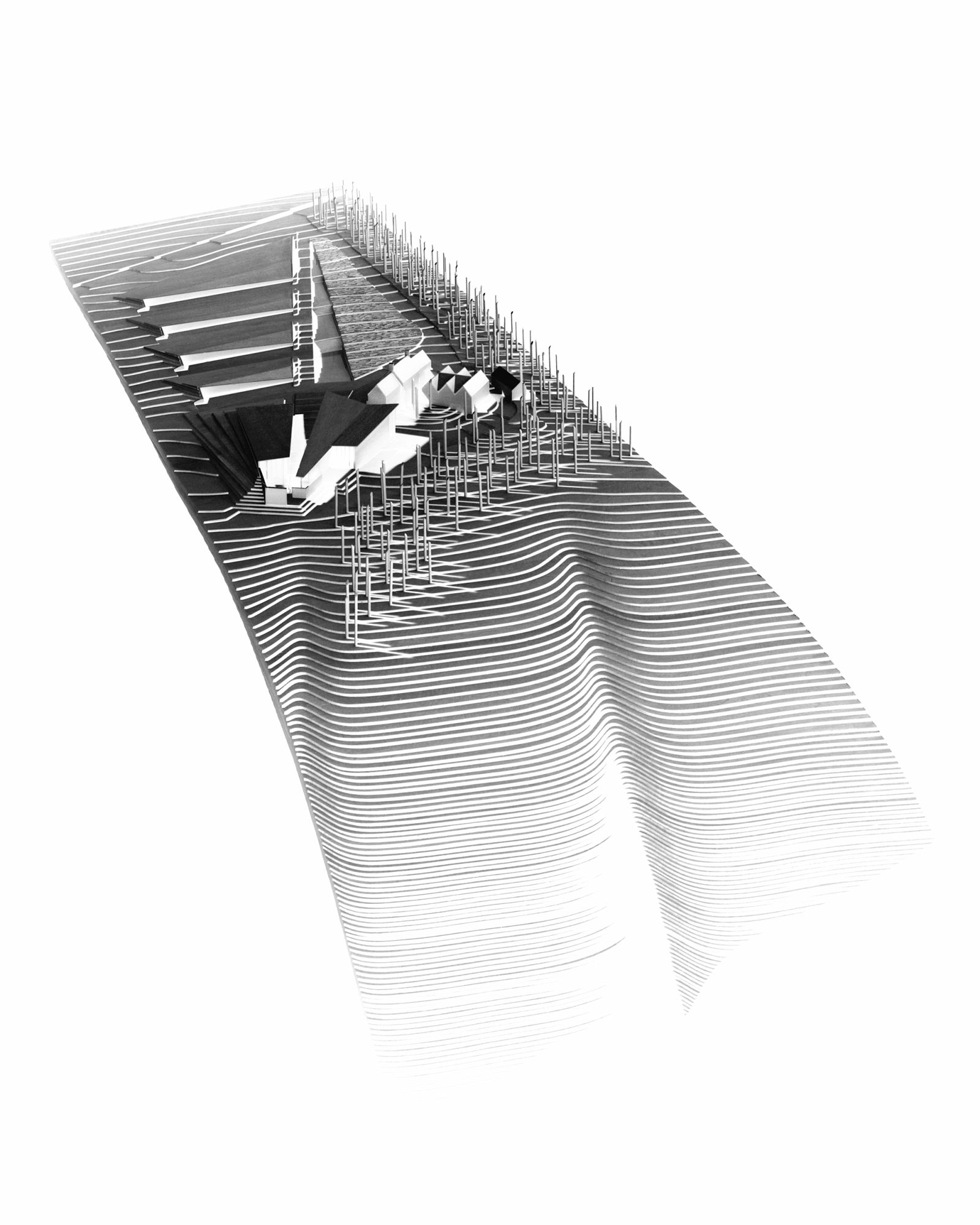 Shifted and carved by a receding ice sheet twenty thousand years ago, the site is marked by a gradual, forty-foot slope. Set within the hillside and adjacent to the existing research facility, the museum is organized into two parallel and interconnected buildings—a public education wing and a new exhibition hall. Together these two structures define the edges of a new cascading plaza, extending views to Cayuga Lake. A series of sculpted landforms structure the site by concealing extensive parking, groundwater recycling, and connecting interior and exterior exhibition programs.