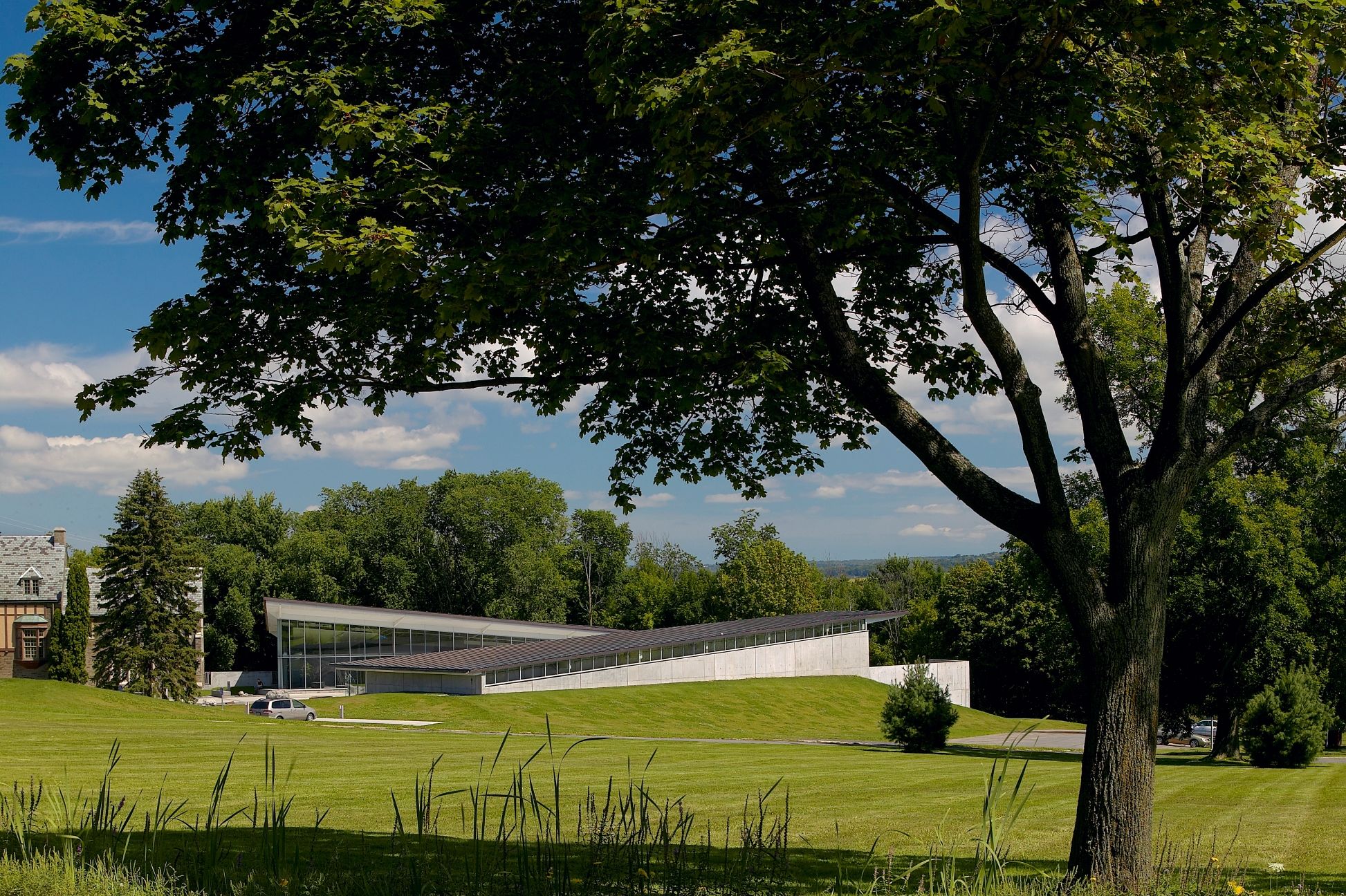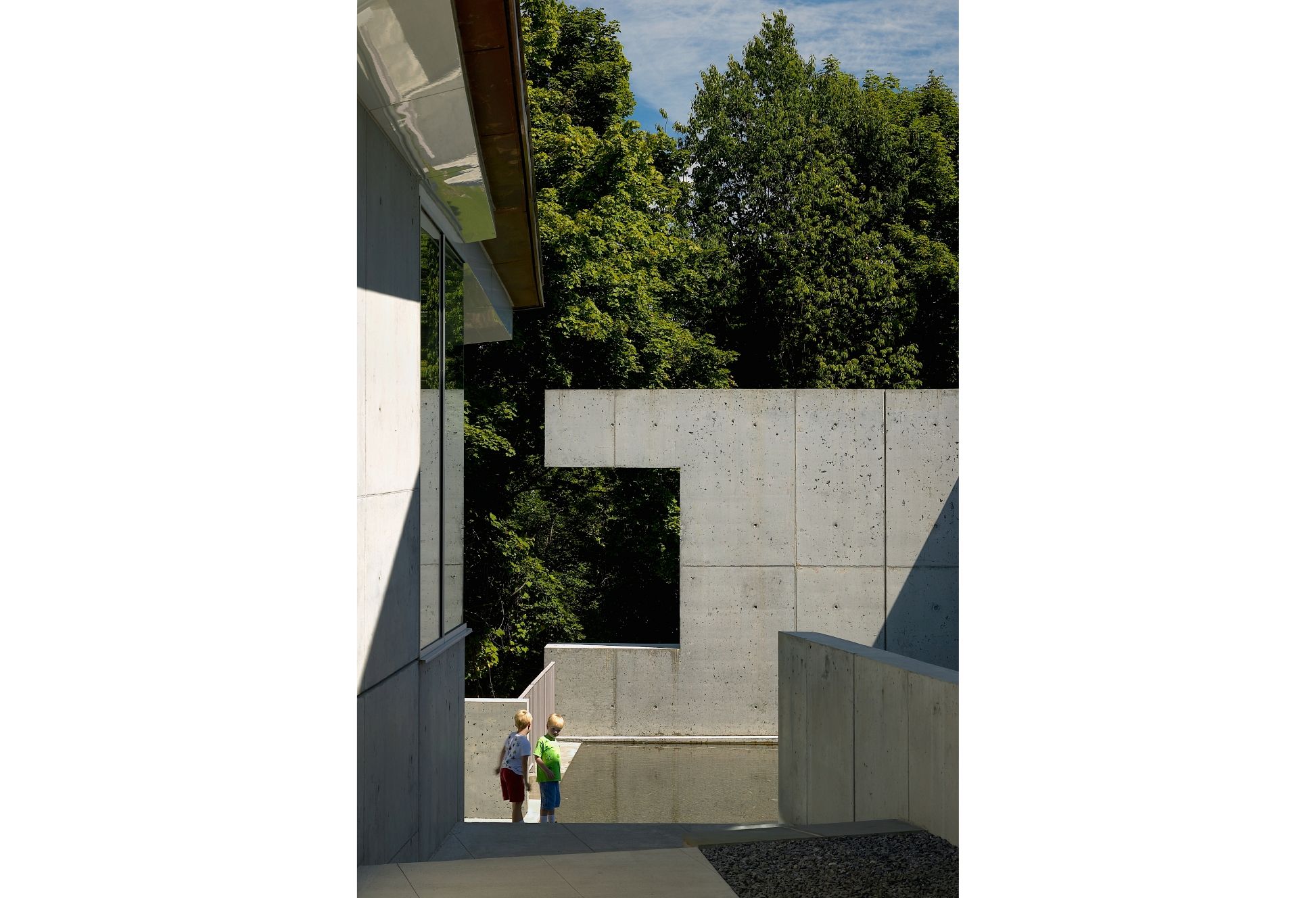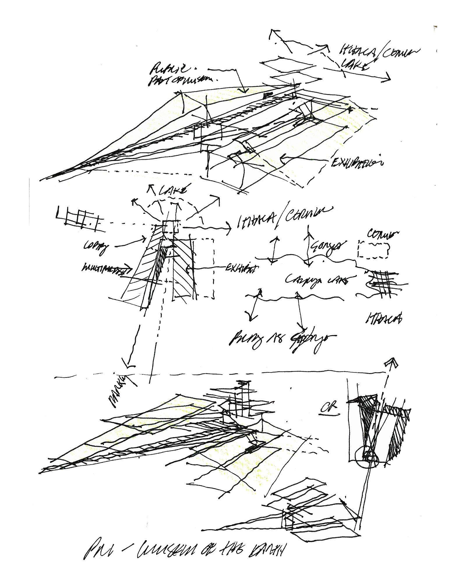 The two museum pavilions define a descending central courtyard, which recalls the spatial condition of many of Ithaca's dramatic gorges.
