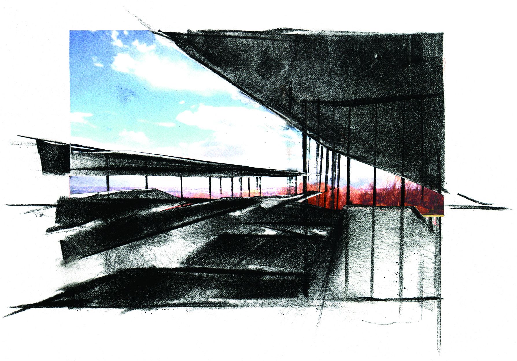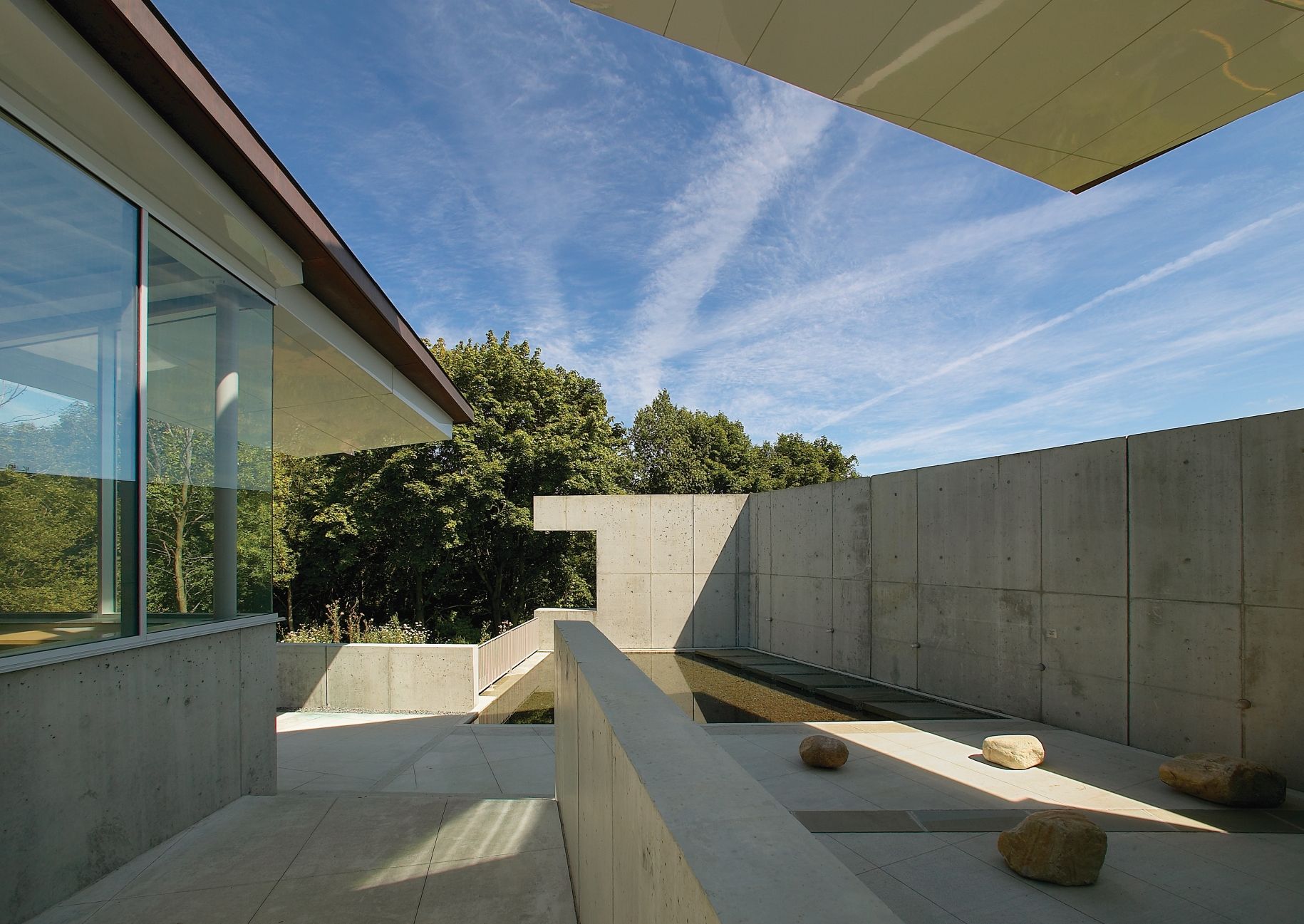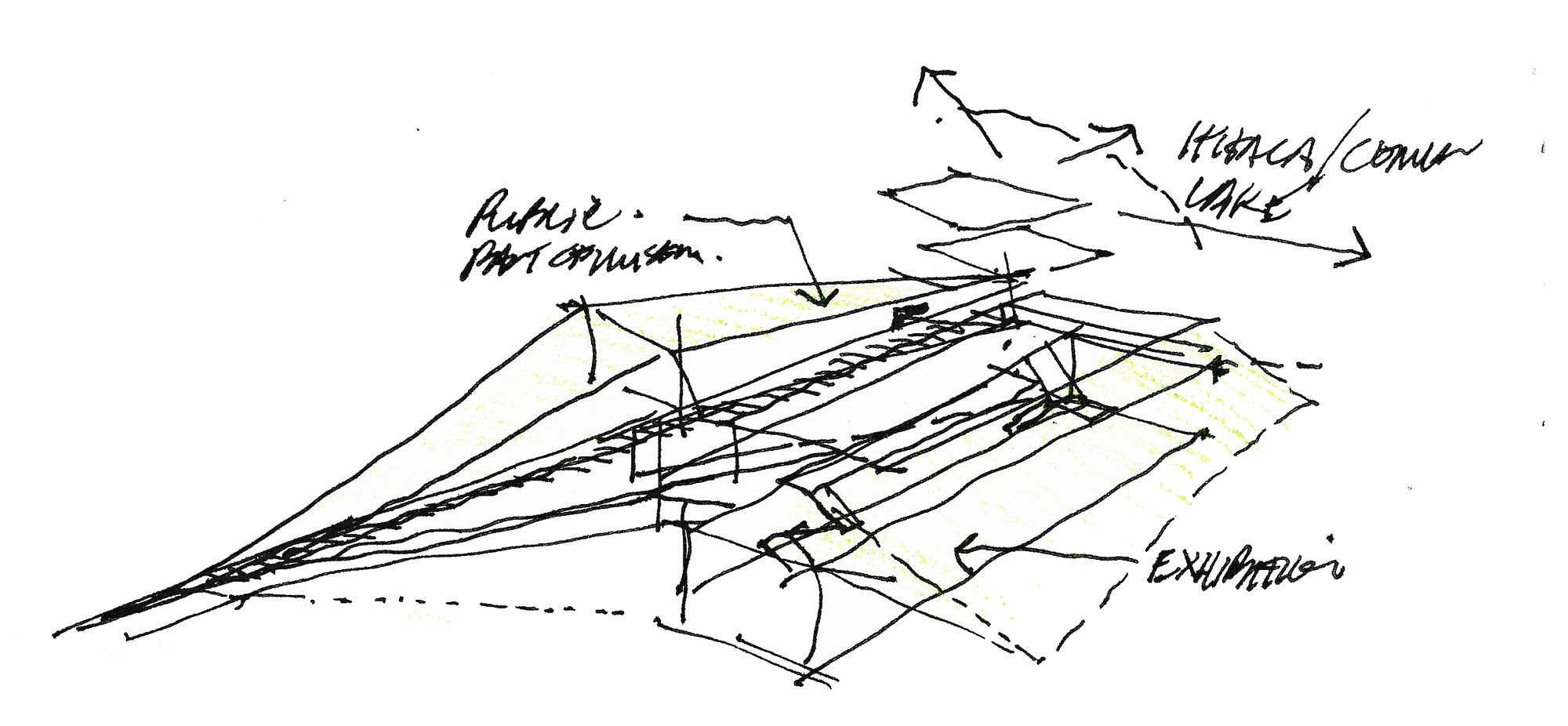 The two museum pavilions define a descending central courtyard, which recalls the spatial condition of many of Ithaca's dramatic gorges.