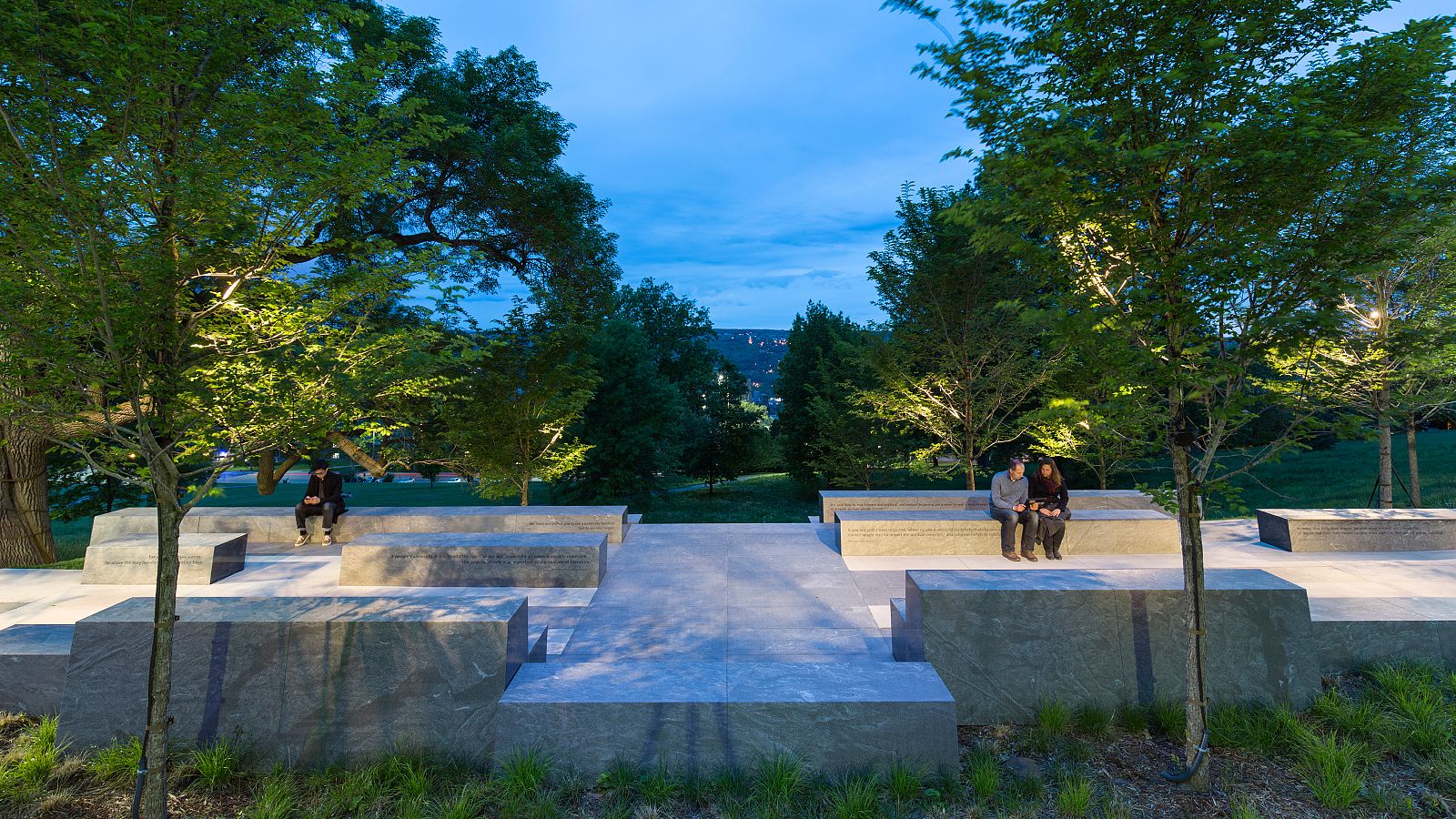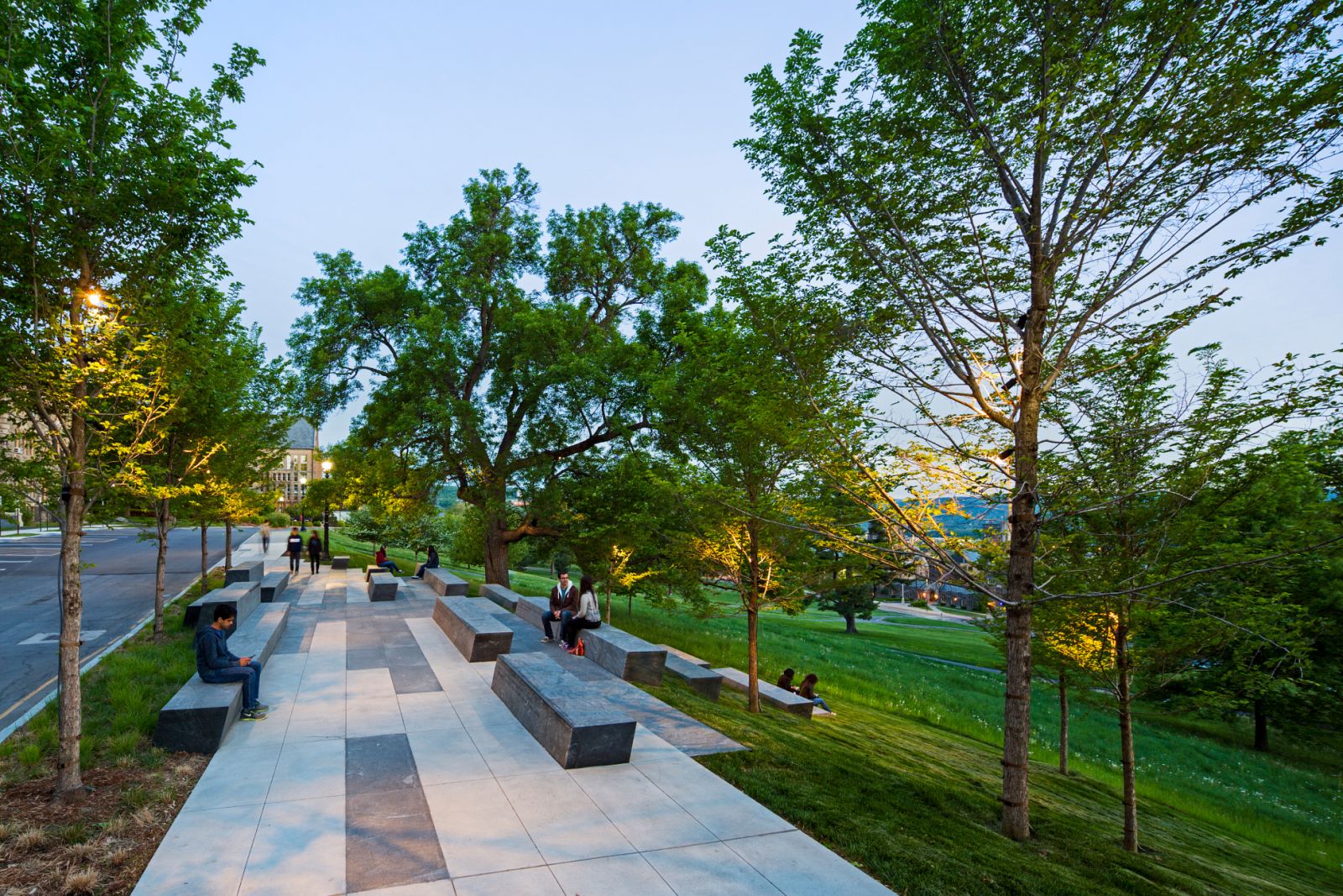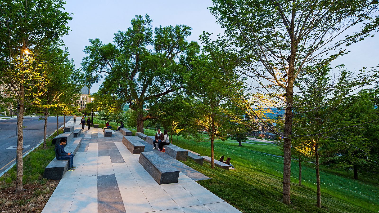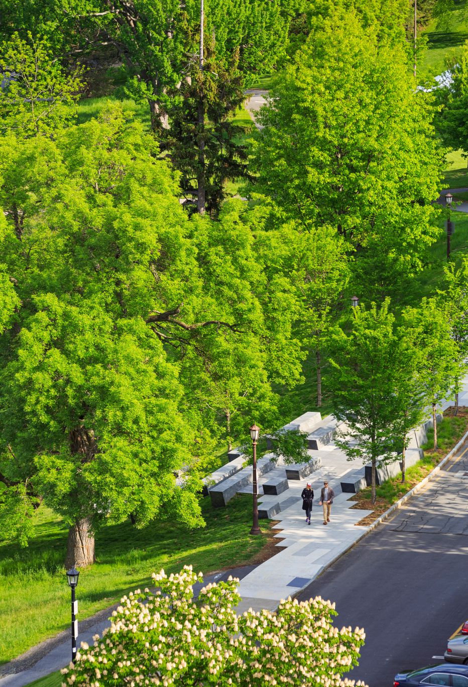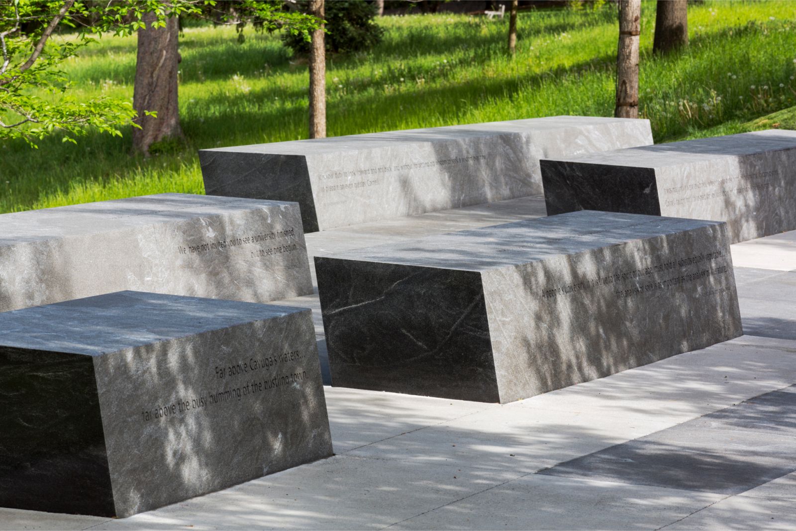 The Sesquicentennial Grove commemorates the many voices that are part of the rich tapestry of Cornell's legacy. Forty-five granite benches are inscribed with a 150-year timeline of historical narratives that begin at the top of the hill and extend beyond the edge of the site.