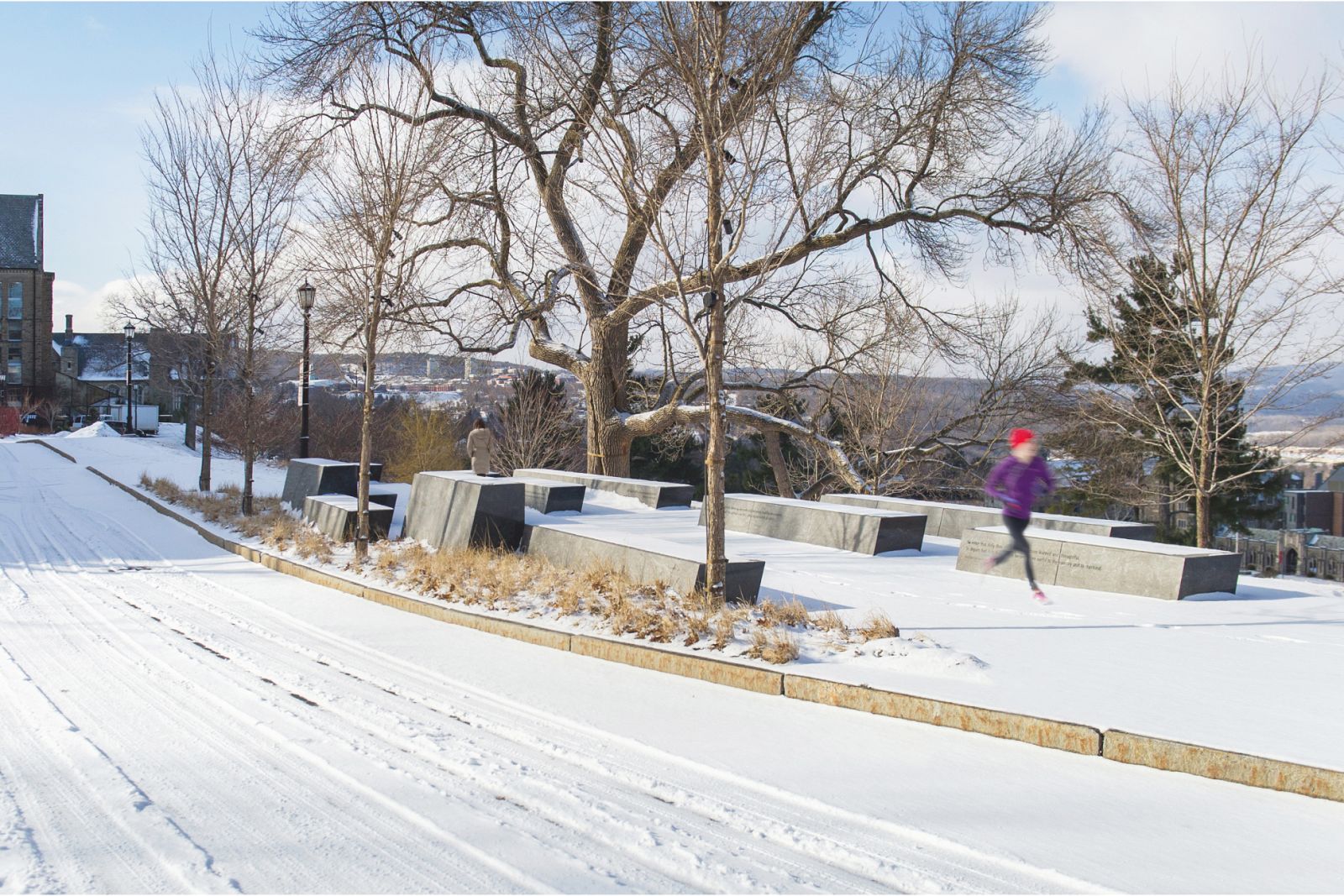 Amidst a grove of elm trees, a series of stone benches appear to emerge from the landscape of the slope. The installation shapes and frames one’s perceptual experience towards the landscape and invites visitors to engage with, contemplate, and expand on Cornell's rich academic and innovative history.