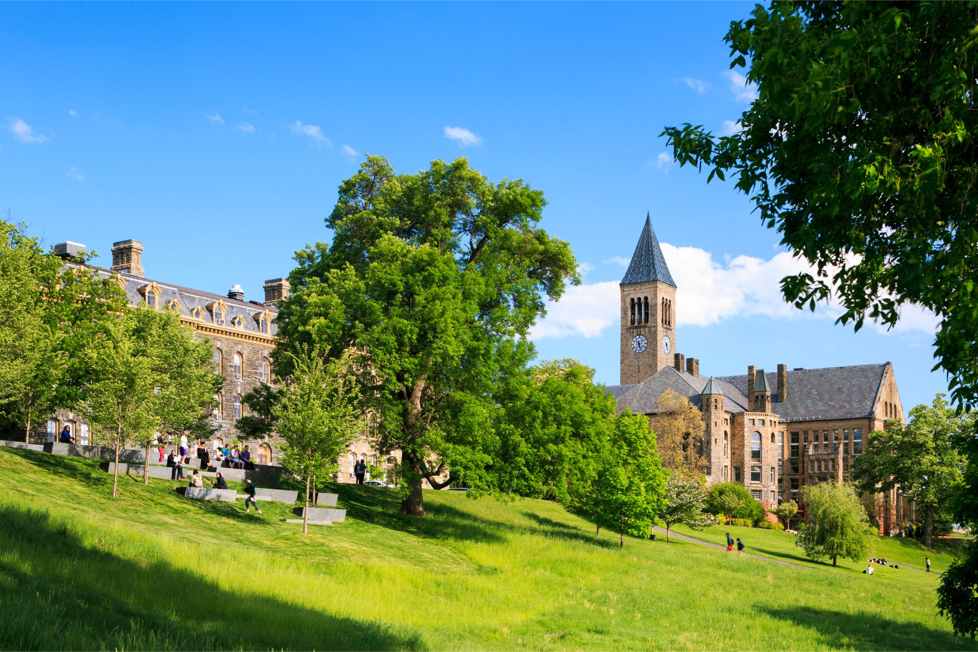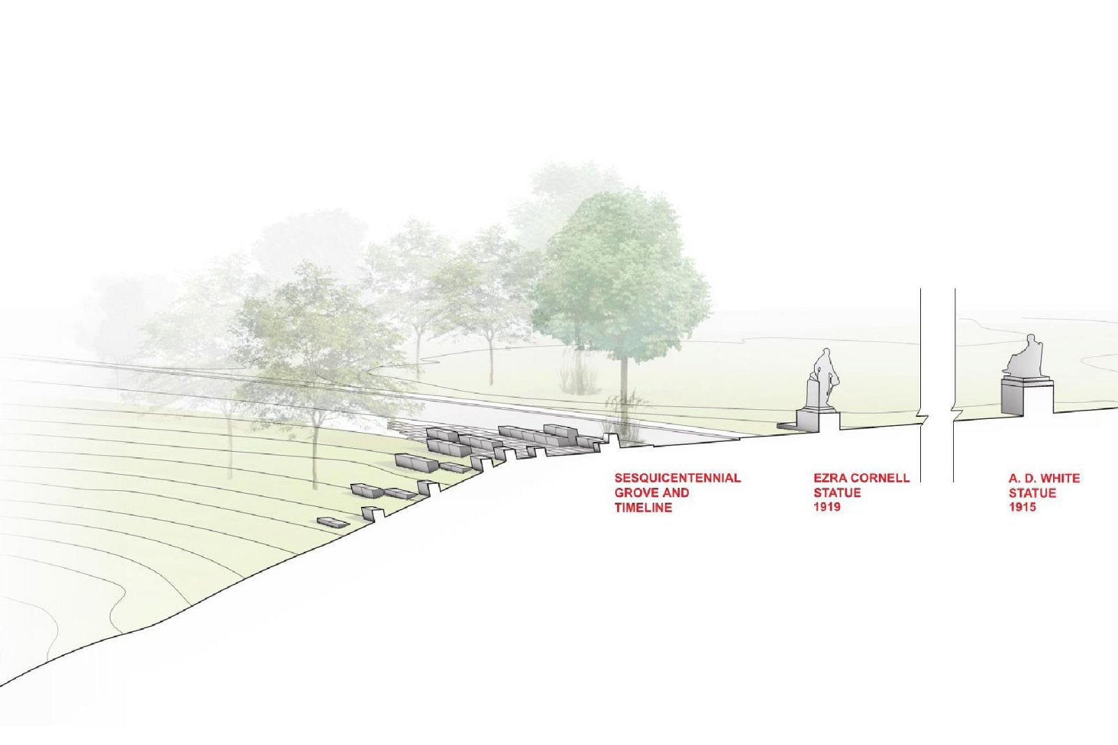 The Sesquicentennial Grove expresses 150 years of rich history at Cornell University through a permanent community gathering place inspired by Cornell's historic landscape and academic legacy. Located on the upper edge of Libe Slope, the Sesquicentennial Grove is an extension of the commemorative axis defined by Ezra Cornell and A.D. White statues.