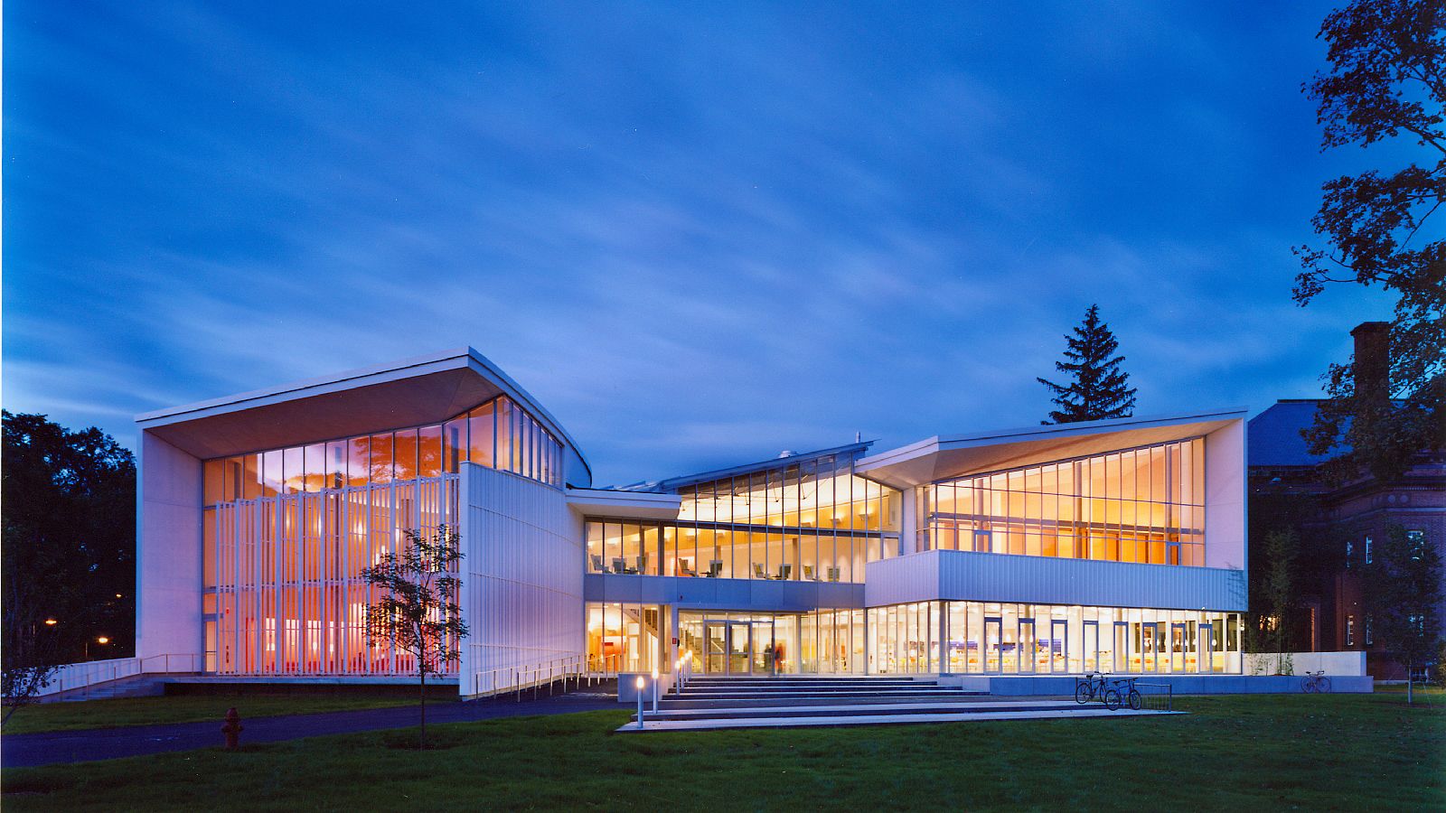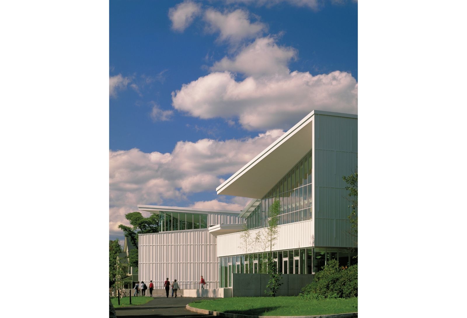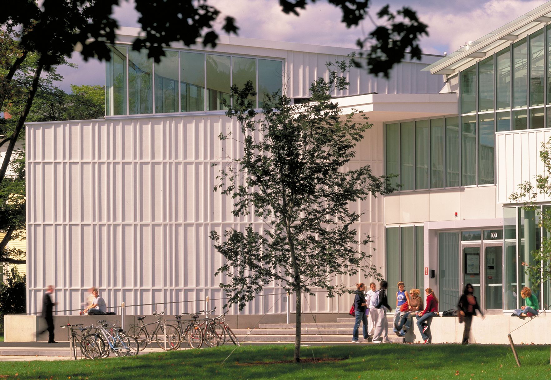 The building's exterior is clad in a white-stained wood panel system reminiscent of the board-and-batten construction and akin to the white clapboard construction of many Northampton buildings.