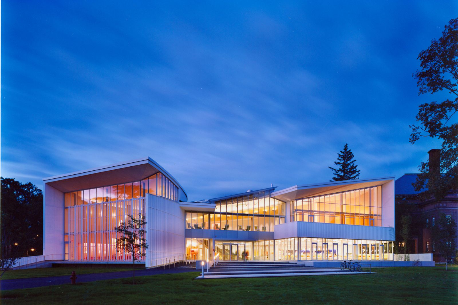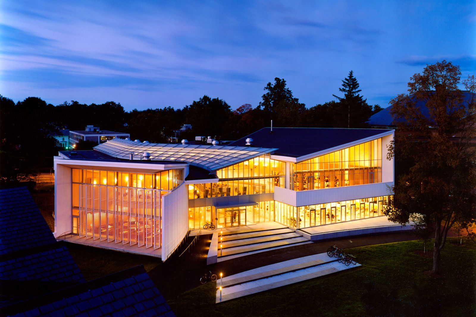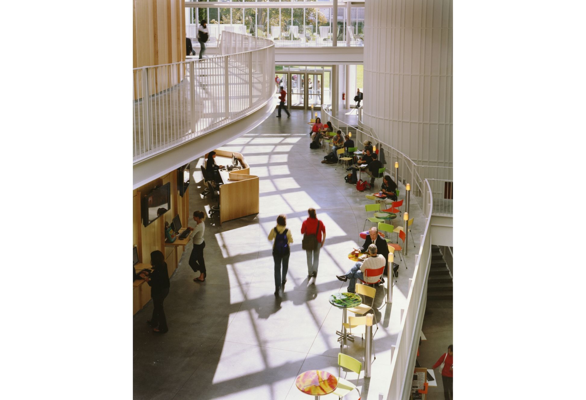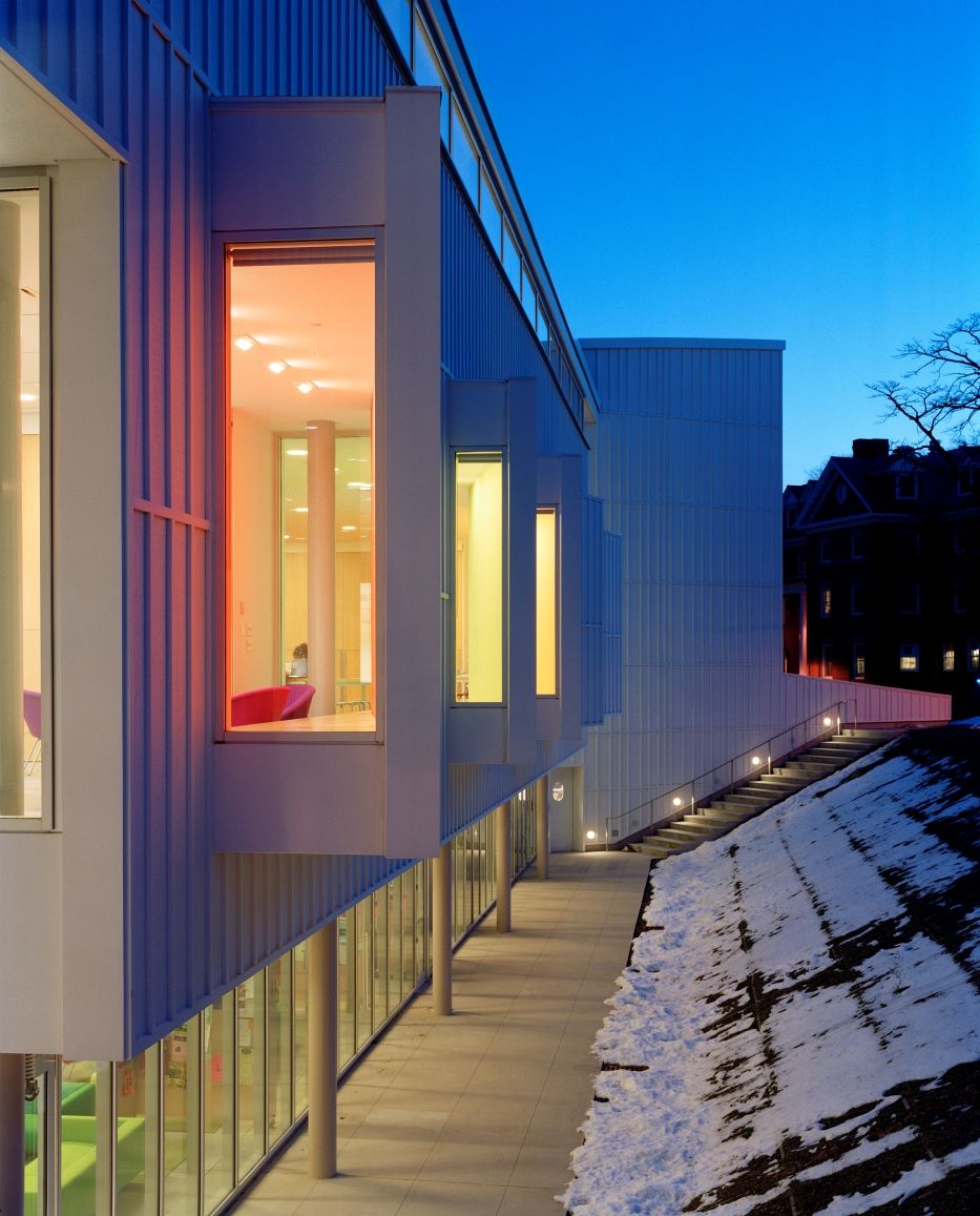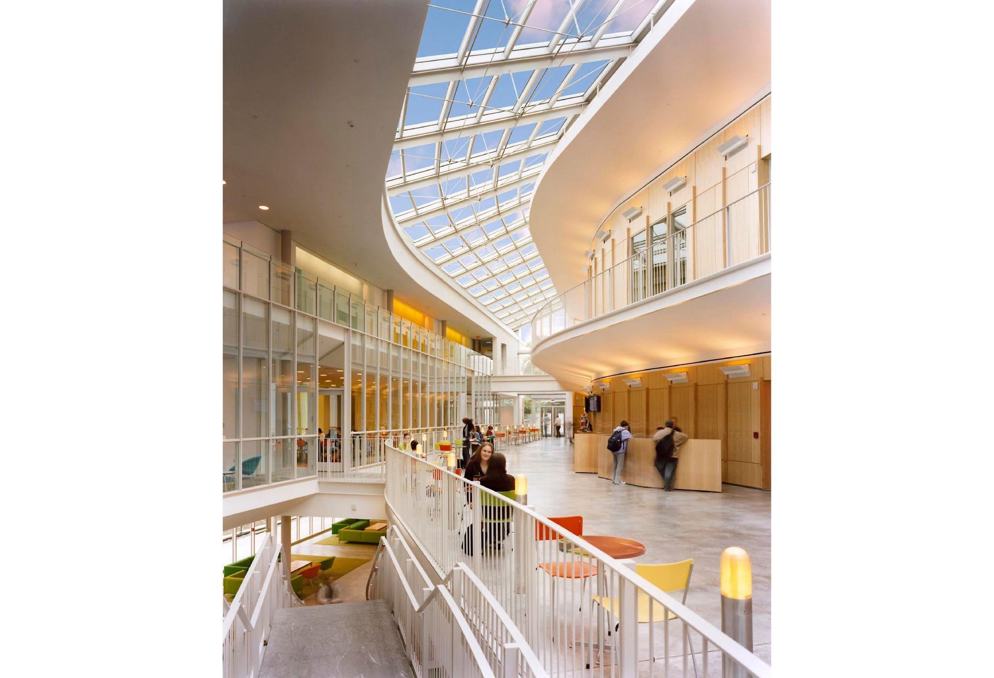 Imagined as an en-route passage through the campus, the building is defined by interconnecting paths that challenge the boundary between inside and outside. These paths converge into a long, curved, skylit gallery that forms the core of the Campus Center. This central corridor is lined with exhibition areas, performance spaces, dining facilities, lounges, mailrooms, and a bookstore. A series of outdoor terraces connect the building's communal areas with the surrounding campus grounds.