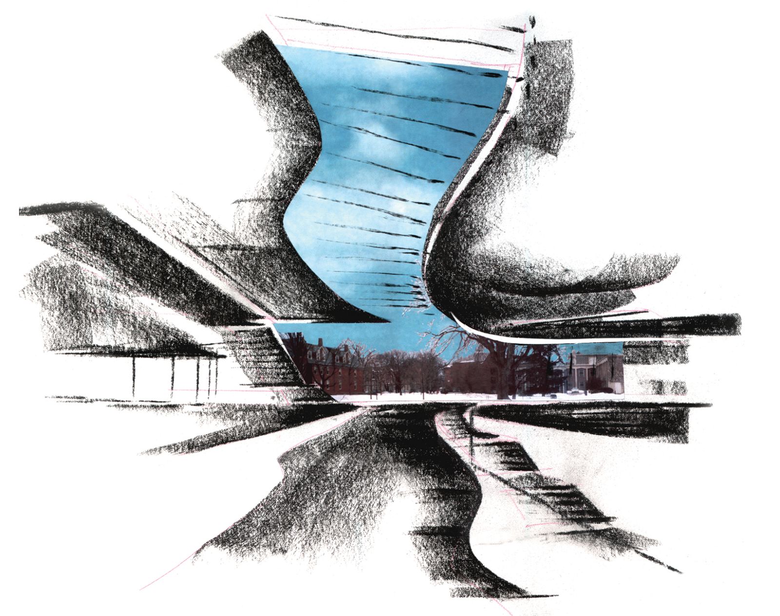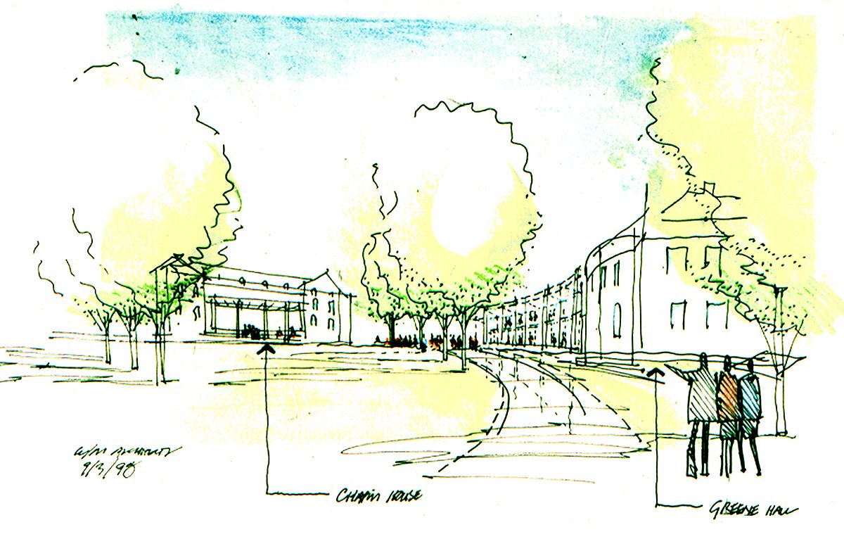 The configuration of the campus center mediates between the finely scaled town streets (Elm Street) and the campus where it expands to frame a newly defined oval.