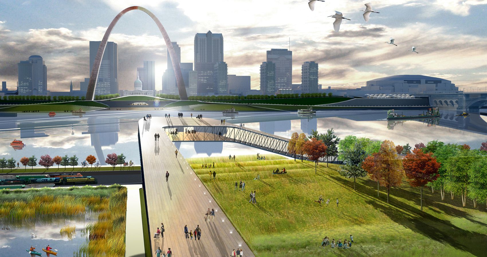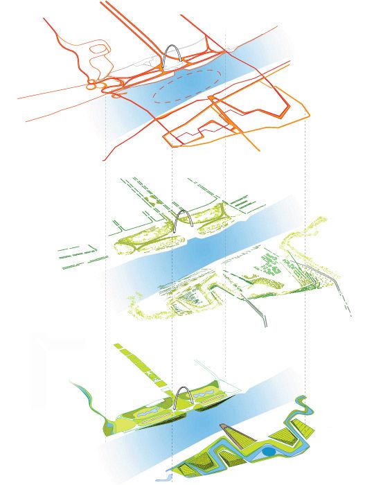 The East St. Louis riverbank offers a dramatic contrast to the modernist icon created by Saarinen and Kiley. Full Circle redefines the landscape as a network of new earthworks, waterways, and paths that meander toward new settings for recreation and public life including the new river center and ecological park that restores the lost river ecologies. New connections between St. Louis and East St. Louis complete the loop. Eads Bridge hosts a new linear park and the piers of Poplar Street Bridge are leveraged to support a new pedestrian and bike route. Full Circle recovers narratives of culture, ecology, transportation, and trade to create one continuous experience.