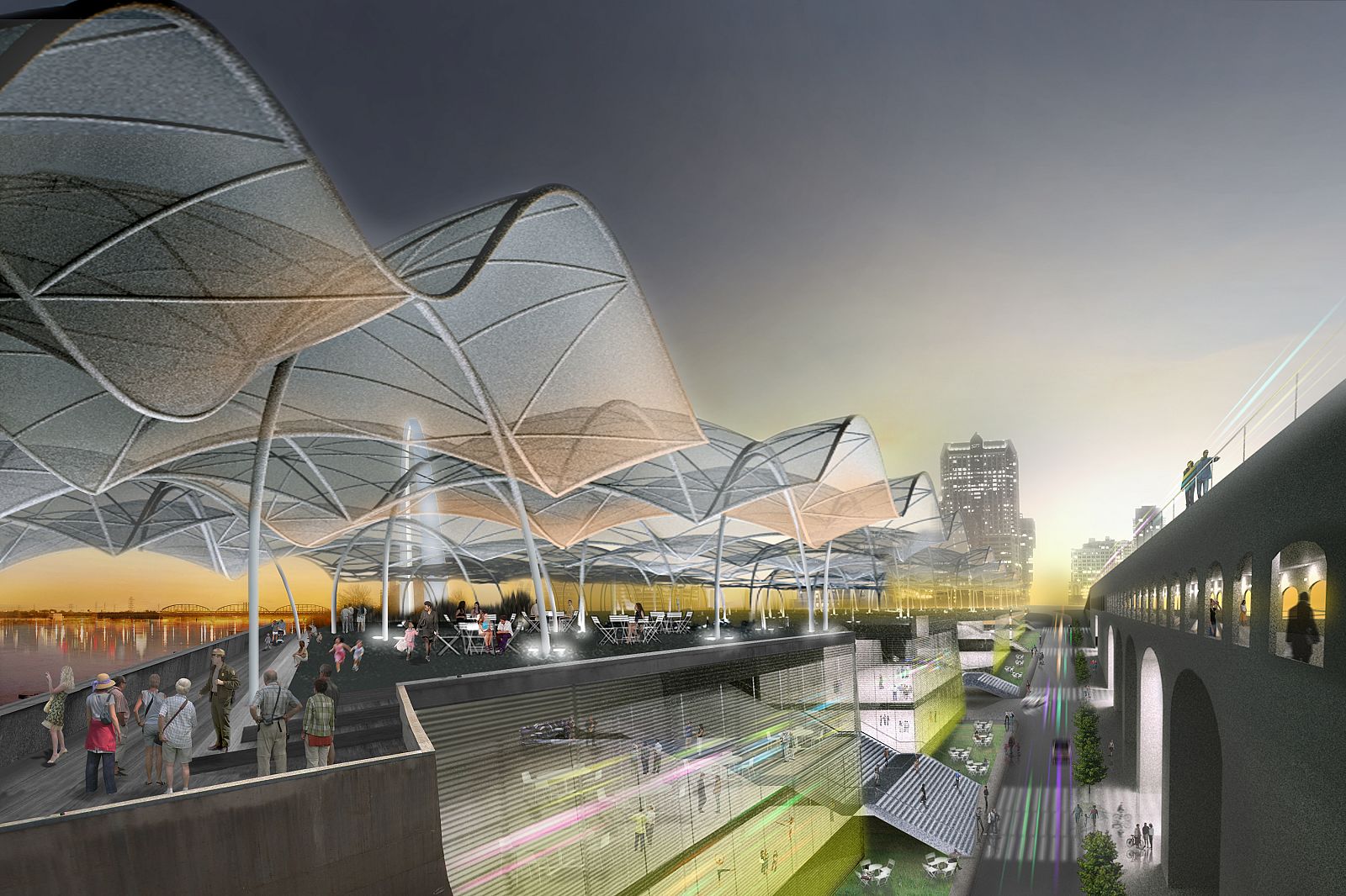 Full Circle reconnects the city to the park and the park to the river, embracing the Mississippi River as its center. Capitalizing on the dynamic movements and infrastructures of the site, the design creates a linked sequence of public settings that weave together to enhance the vibrancy and layered identities of the park. The monumental civic axis of St. Louis is extended over the highway to connect the city to the park. Strategic improvements to the memorial grounds preserves the Gateway Arch. The expanded museum acts as a catalyst to bridge history and community, culture and ecology, integrating the site into a larger cultural network of the St. Louis region.