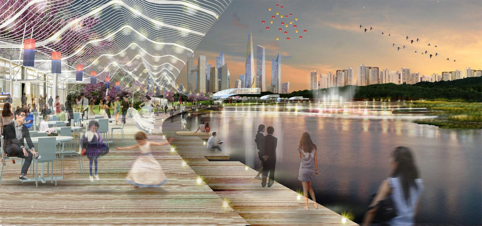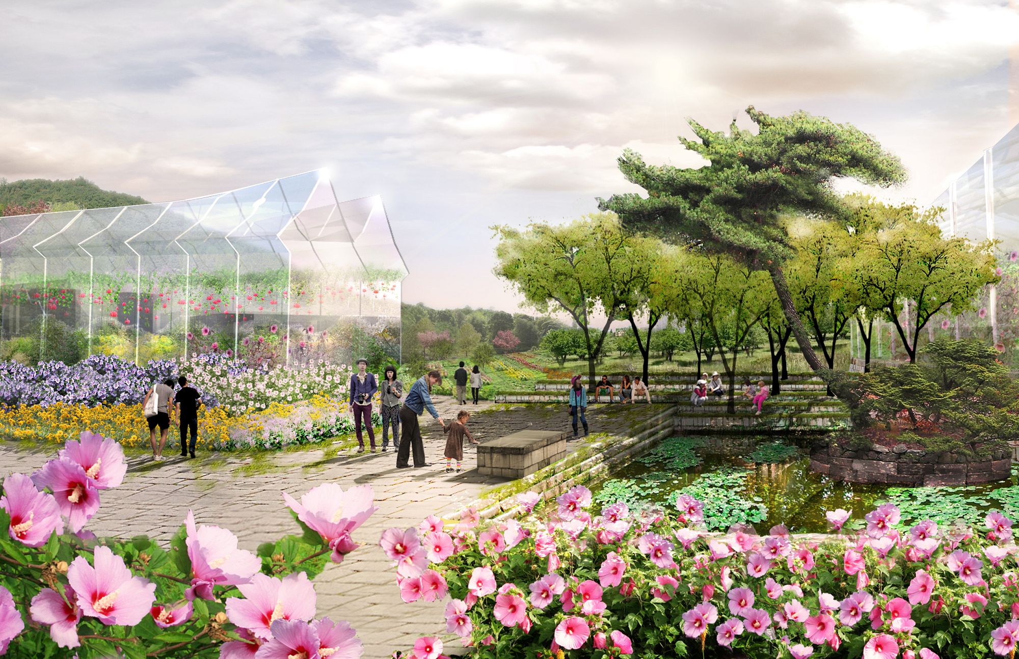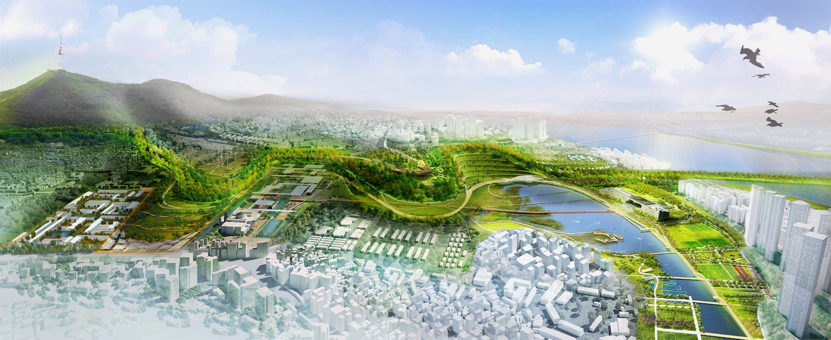The design shapes one continuous meandering line, an ecological spine, that descends from Namsam Mountain and wanders through the park to frame distinct and memorable "Parks within the Park," reconnecting existing neighborhoods and extending across the Han River. This wandering line, rich with woodland walks and outlooks, combines architecture and landscape to enhance the topography of the site, link multiple programs, and offer dynamic views of the city and mountains beyond.