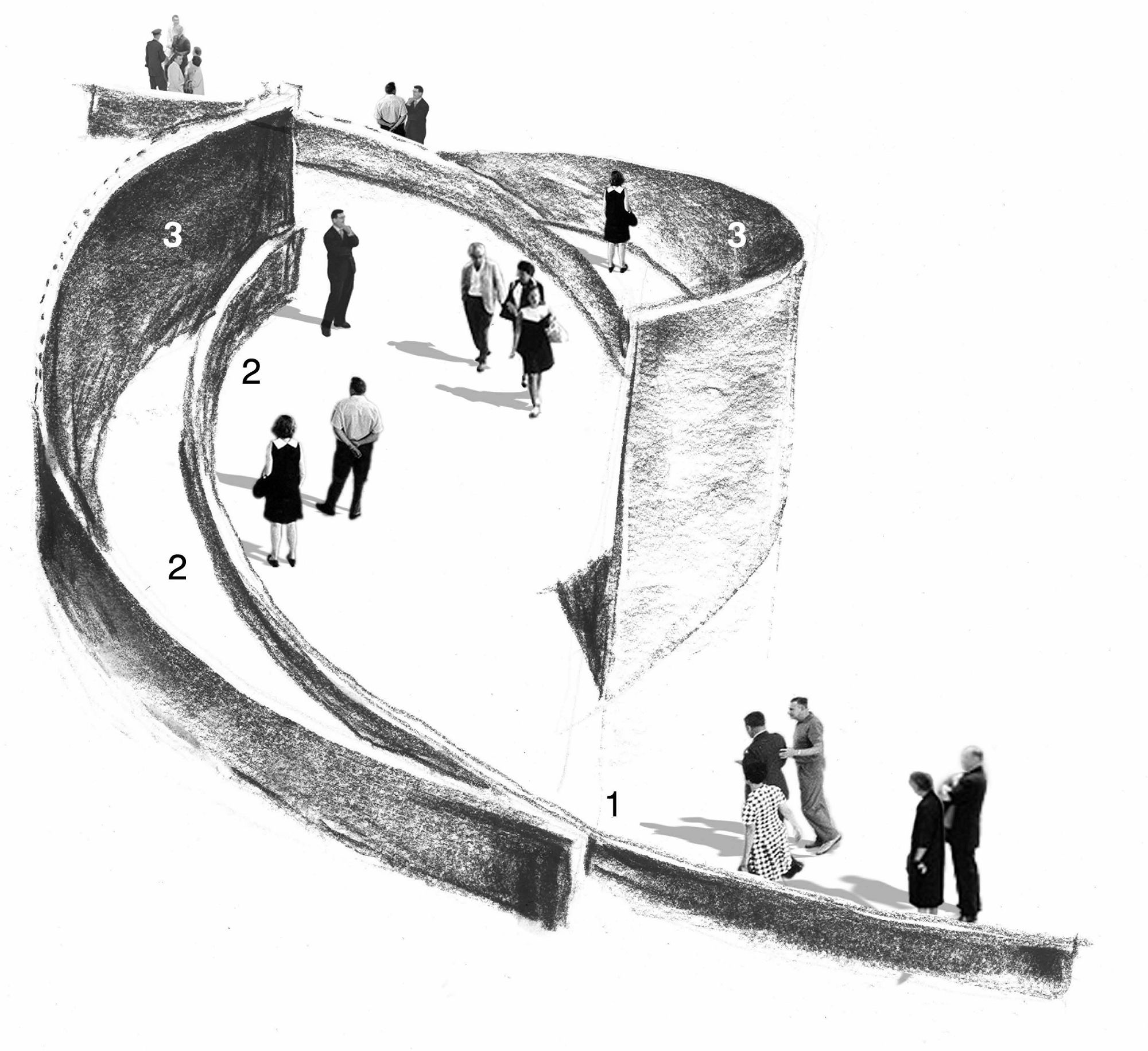 In its curving, open form, shaped by two monumental crescents, the installation creates a space to consider the impact of architecture, landscape and infrastructure on the choreography of daily life. Through the presentation of models, sectional studies, and films, "Lines of Movement" illuminates the fertile ground in the space between city and garden, art and ecology, and infrastructure and intimacy to create lasting public settings.