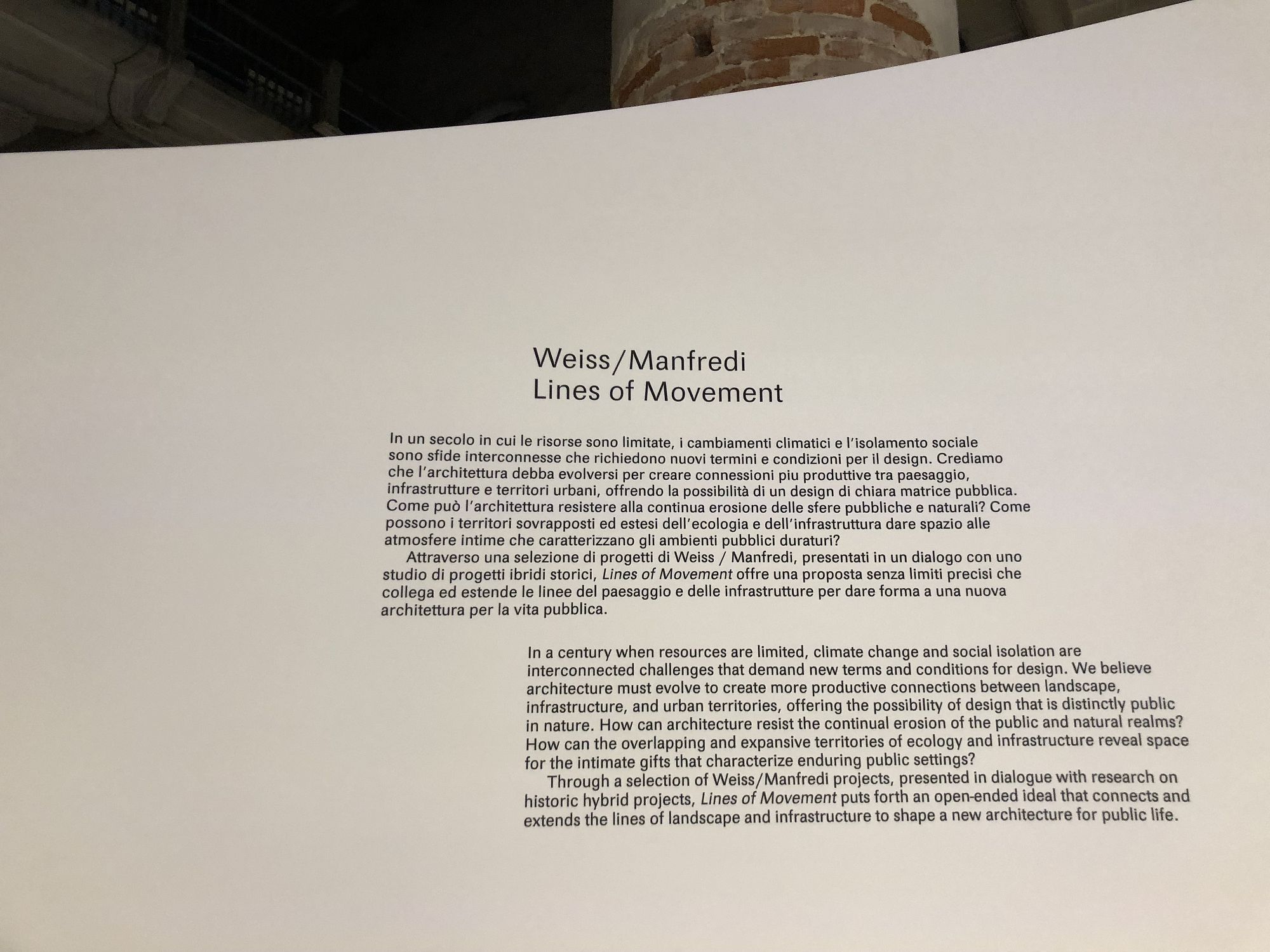 Weiss/Manfredi's immersive installation "Lines of Movement," on view in the 2018 Venice Architecture Biennale, examines the new terms and conditions for design in a century when natural resources are limited and further challenged by the interconnected issues of climate change and social isolation. Through a selection of Weiss/Manfredi’s work, presented in dialogue with historic hybrid projects, "Lines of Movement" puts forth an open-ended ideal that connects and extends the lines of landscape and infrastructure to shape a new architecture for public life.